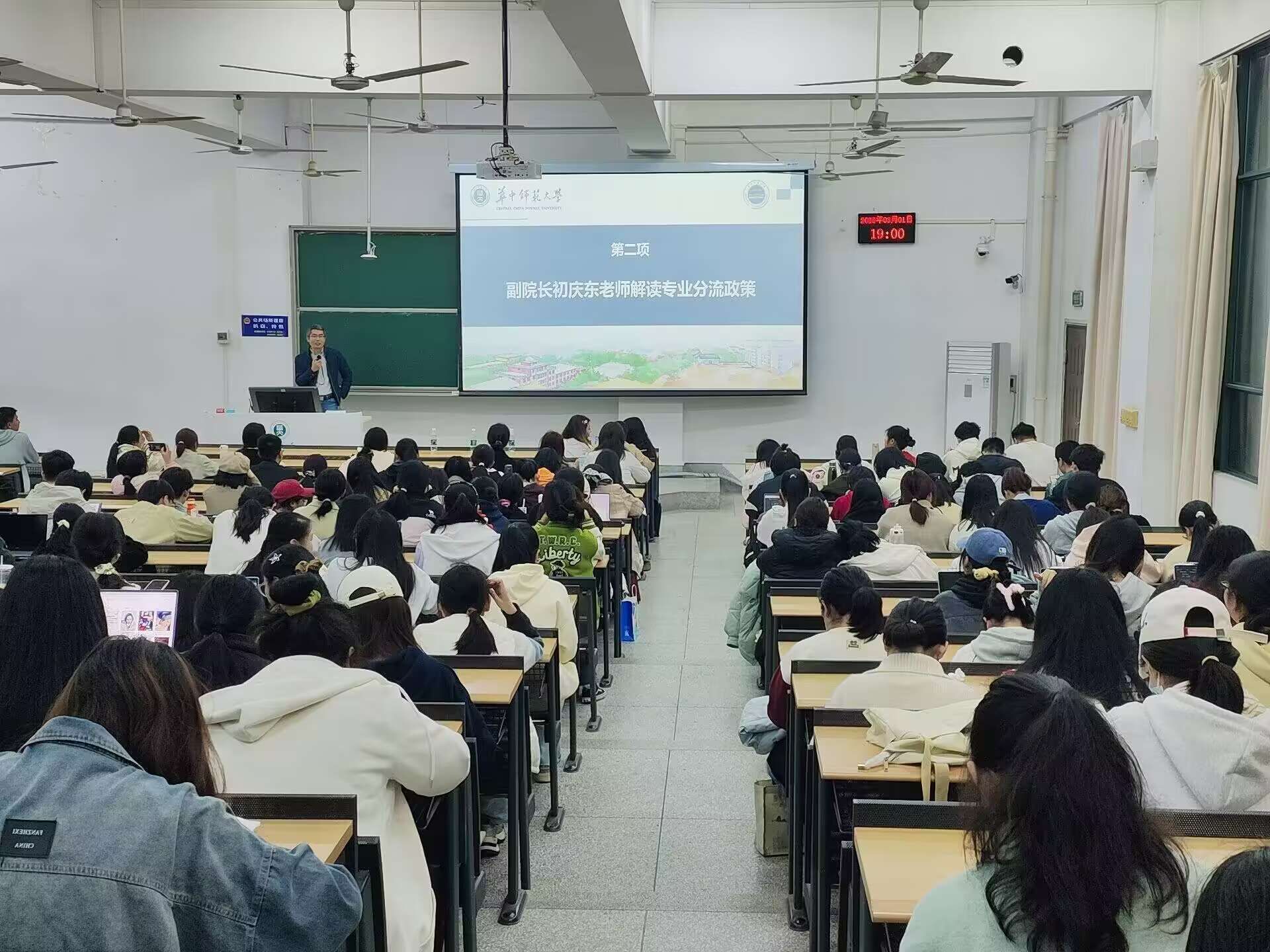解码专业密码,启航多元未来。初庆东为学生们解读了历史学大类专业分流相关政策和情况。他结合优秀毕业生在教育、文博、史学研究等领域的职业发展案例,阐述了分流之后自费师范、文化遗产与文化产业、基地、开沅四个方向的发展规划和现实情况,诠释历史学科的多元可能,鼓励大家按照自身发展需求和兴趣志向进行选择,并结合自身教学经历为大家提供了宝贵的建议,让大类学生对未来规划有了较为清晰的认知。