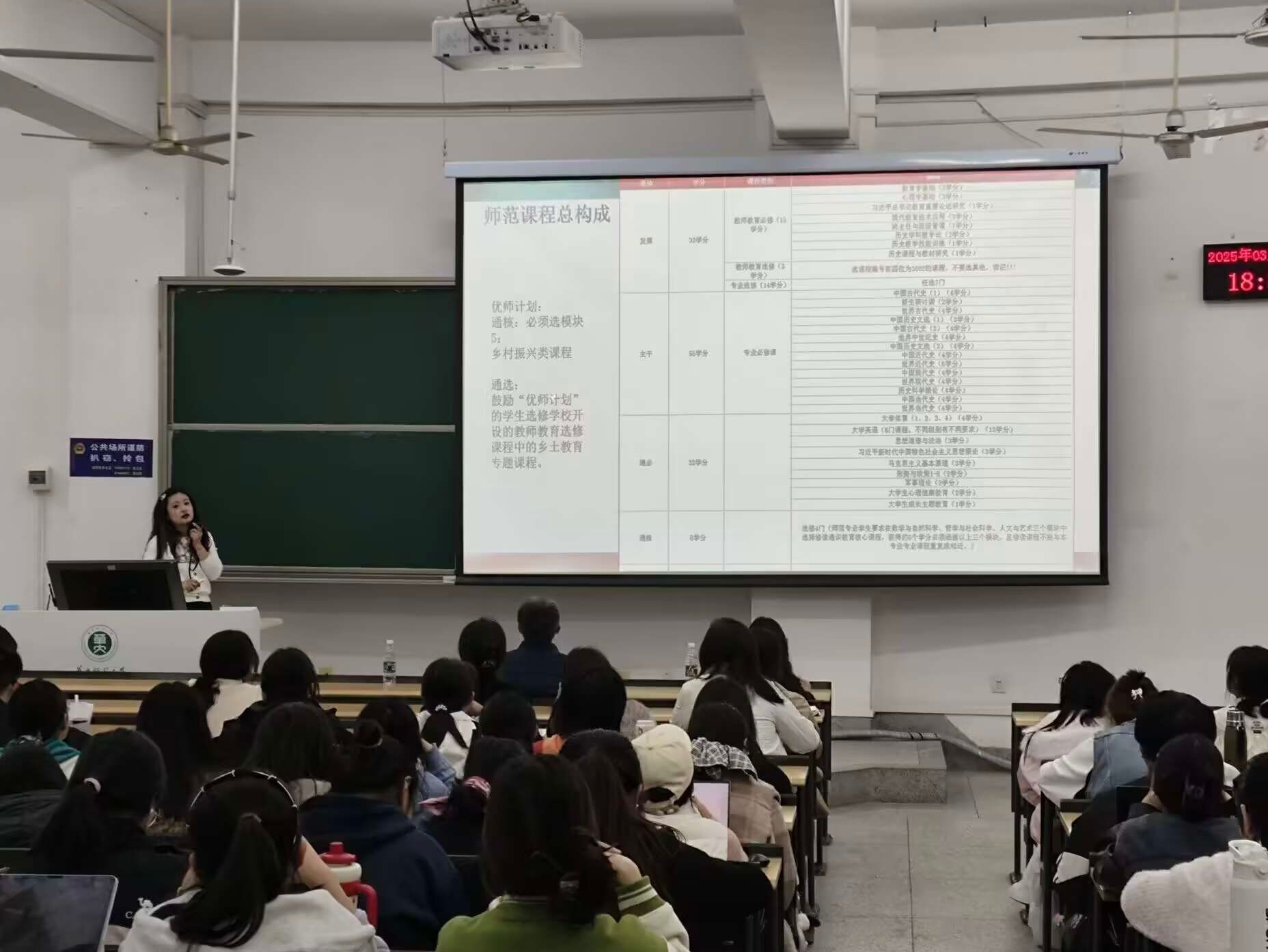 深研课业经纬,构筑成长基石。王文勤围绕学院的人才培养方案进行了选课指导,强调了不同专业的培养目标、课程设置、学分要求和选课注意事项。她以师范类课程为例,详细讲解了本科生应修学分的总分构成,包括教师教育必修、选修课程以及专业必修课等,并指出了选课时需关注的课程编号和学分核算。王文勤提醒学生注意体育测试达标、计算机能力要求以及毕业学分的完成要求,同时强调教务管理系统课表核对事宜,并针对现场学生们的疑问进行了答疑,明晰了学生们对选课与学业的规划。