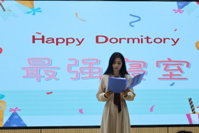 活动伊始,主持人占雨菲介绍了本次比赛的规则和流程。接着进入活动的第一环节“爱寝大作战”,参赛寝室代表按照抽签顺序依次上台对寝室风采展示,选手们以图片、音频、视频、才艺展示等方式展现了各自温馨舒适的寝室环境以及多彩丰富的寝室文化,活动现场掌声不断。