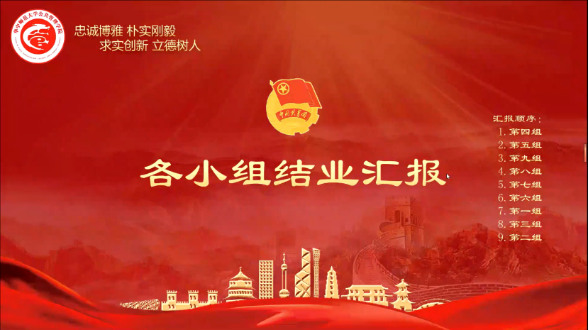 会议开始,主持人魏圆梦依次介绍各位参加典礼的嘉宾并表示热烈欢迎。随后进行典礼第一项:小组结业汇报环节。各小组井然有序地进行展示,纷纷讲述在团干培训中精神层面与实用技能层面的所思所得与成长,每组展示各有特色、尽显团学风采。