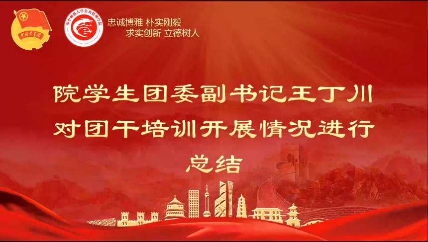 小组汇报结束后,王丁川对团干培训进行总结。她分别从学院参与的人数和分布情况、团干培训的课程设置等方面讲述了本次培训情况。接着,她详细地说明了学员考评的设置流程,公布了考评结果,并对考评结果进行了分析与点评。最后她结合自己在团学工作上的经历给予每位团学成员真挚的期盼与祝愿。