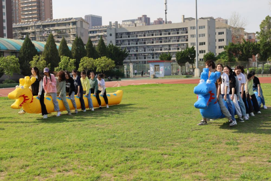 上半场活动中,各小组依次参与“袋鼠跳”“摸石过河”“保龄球”“旱地龙舟”四个项目。在“袋鼠跳”和“摸石过河”中,各小组成员紧密协作、奋勇拼搏,观众在一旁加油助威。进行“保龄球”的过程中,各小组的代表各展英姿,瓶子被碰倒的一瞬间队友和观众发出一阵阵惊呼。各小组成员在“旱地龙舟”的活动中齐心协力,动作整齐划一,各组都拼尽了全力,展示出最好的风采。