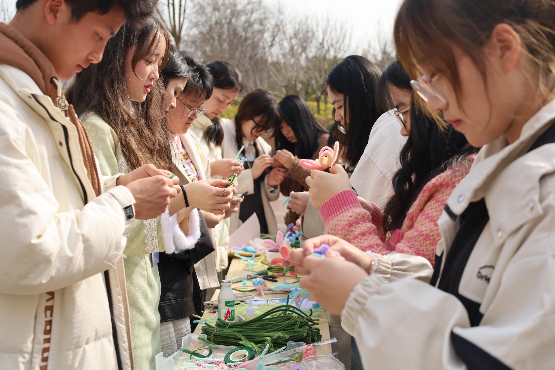 “色斗新鹅松粉细,樱红笋绿玫瑰紫”,自制花束摊位上,同学们将各色扭扭棒巧妙搭配,制作出一束束手工花束。这些花束象征着温暖与关怀,传递着她们对美好生活的向往和追求。