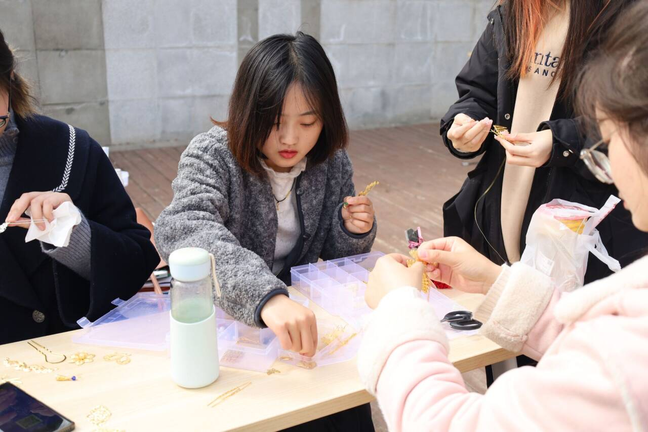 “青丝渐绾玉搔头,簪就三千繁华梦”,自制发簪摊位同样精彩纷呈。同学们用各种材料制作出发簪,有的古朴典雅,有的时尚别致。每一支发簪都承载着女生们的美好愿景,展现了她们对古典情怀的热爱与传承。
