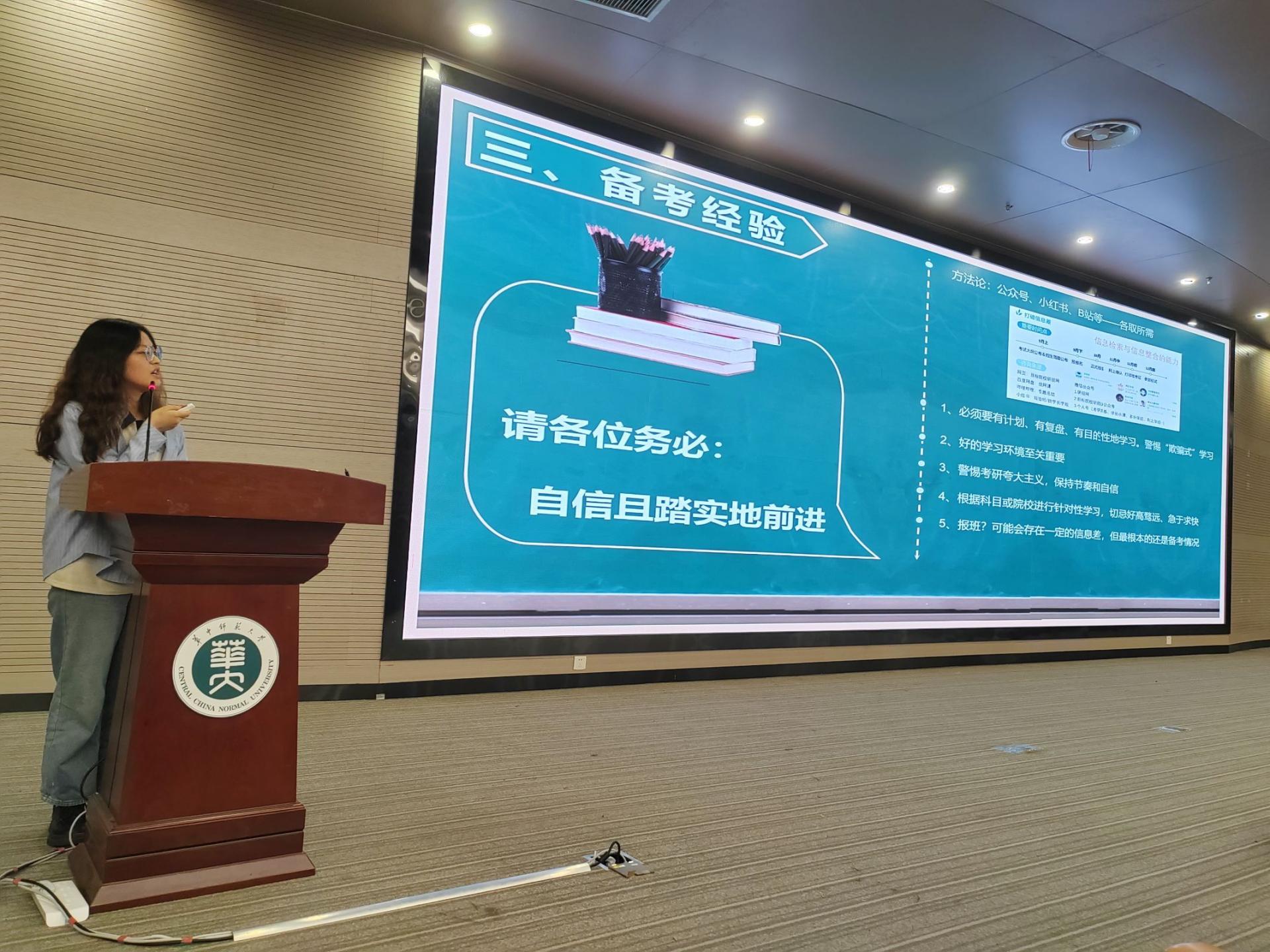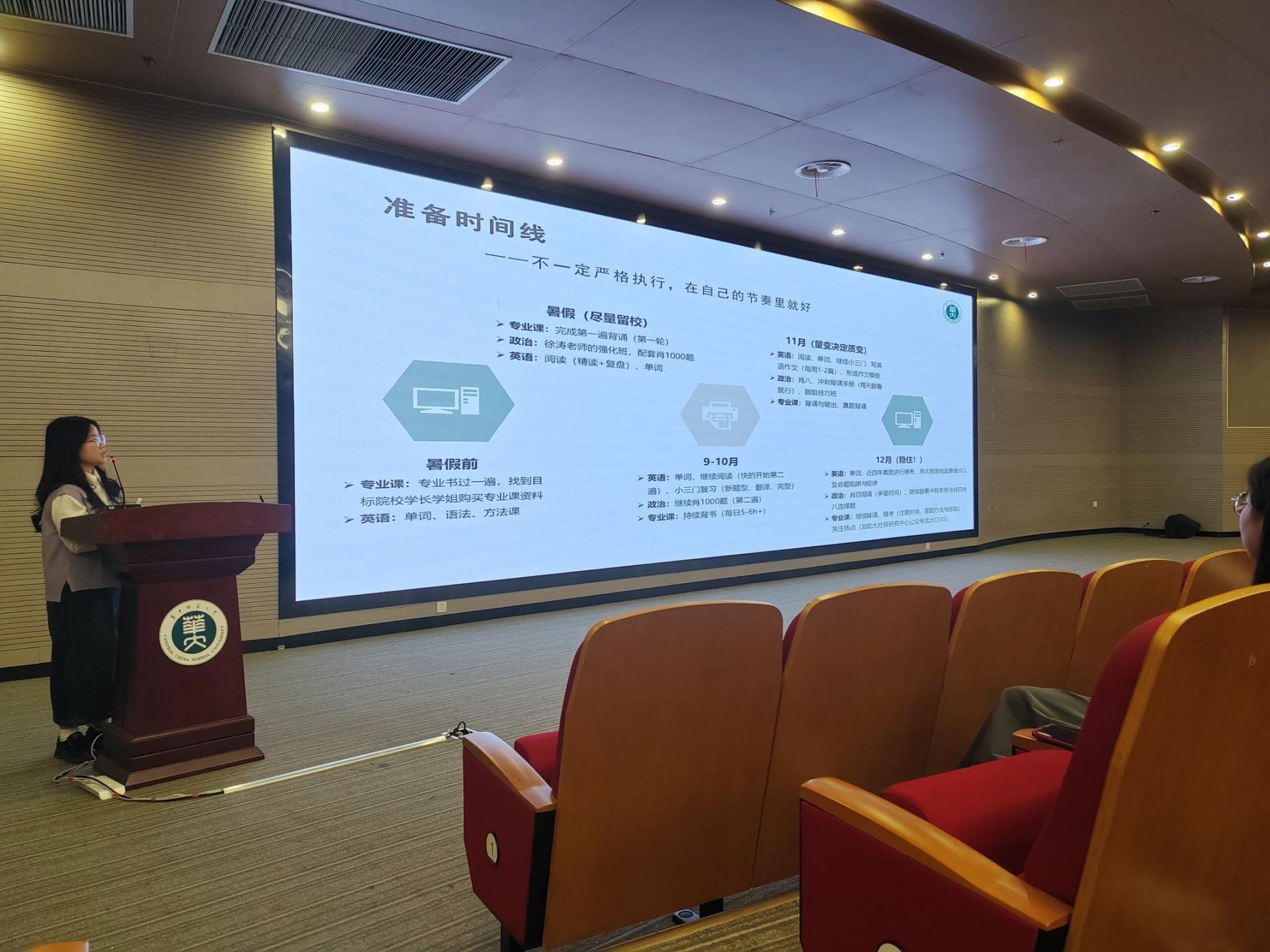常思远围绕择校原则、备考方法和自身的心路历程三个方面展开分享。她结合自己的复习经验,详细介绍了英语、政治和专业课的复习方法,建议同学们要制定合理的学习计划,掌握科学的复习方法。