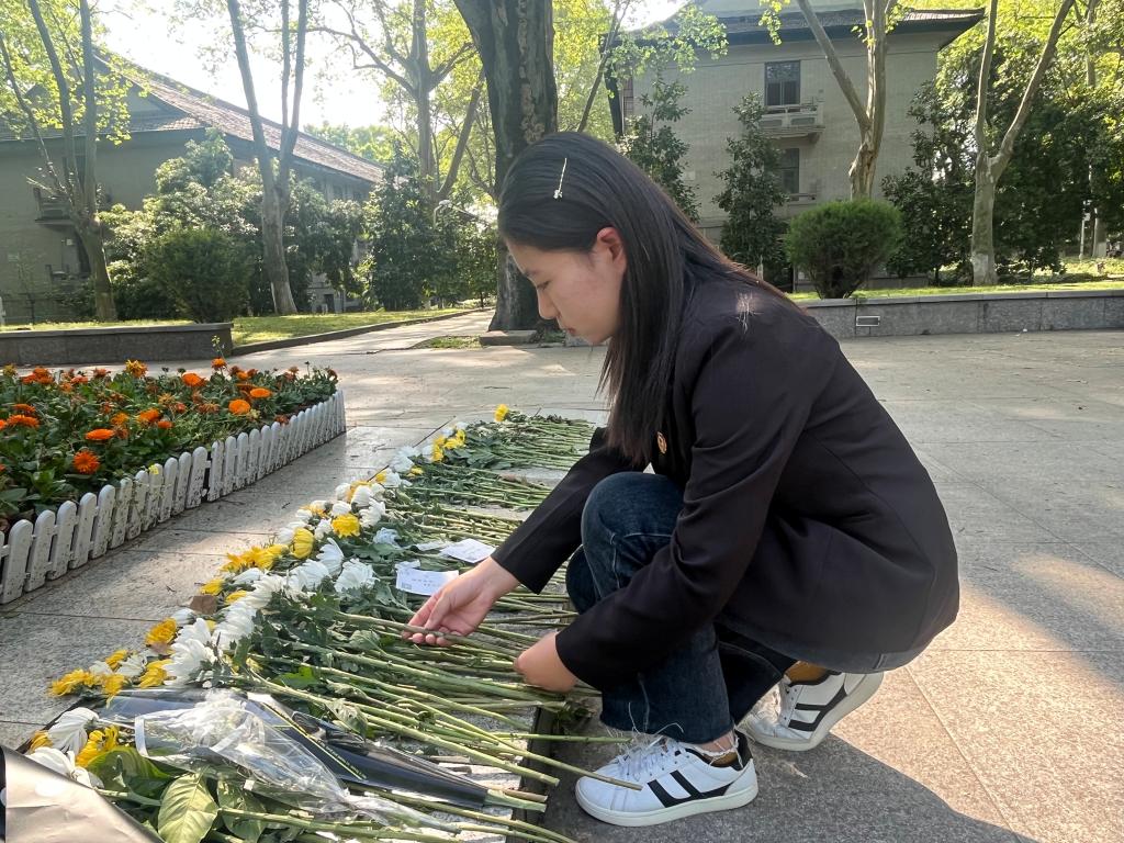 齐诵箴言后,青苗班成员们立于恽代英先生的雕像前,在肃穆的氛围中静默缅怀。学员们依次上前献上白菊,并深深鞠躬以示尊敬与怀念之情。斯人已逝,精神长存,雕像前铺开的朵朵白花寄托着全体学员对先生的追思与崇高的敬意。