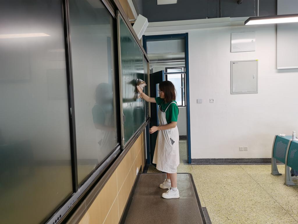 依照前期任务分配,每位成员需要清理三个教室的黑板。在活动过程中,成员们秉持着认真负责的态度,努力推动本次活动顺利开展。首先成员们用黑板擦将黑板上的粉笔字迹擦除,有些教室黑板上部位置较高,成员们站上凳子,保证将整块黑板字迹都擦除完毕。