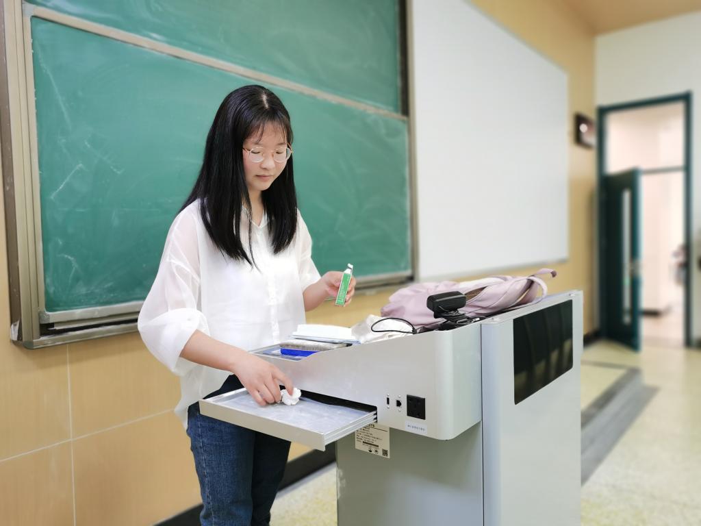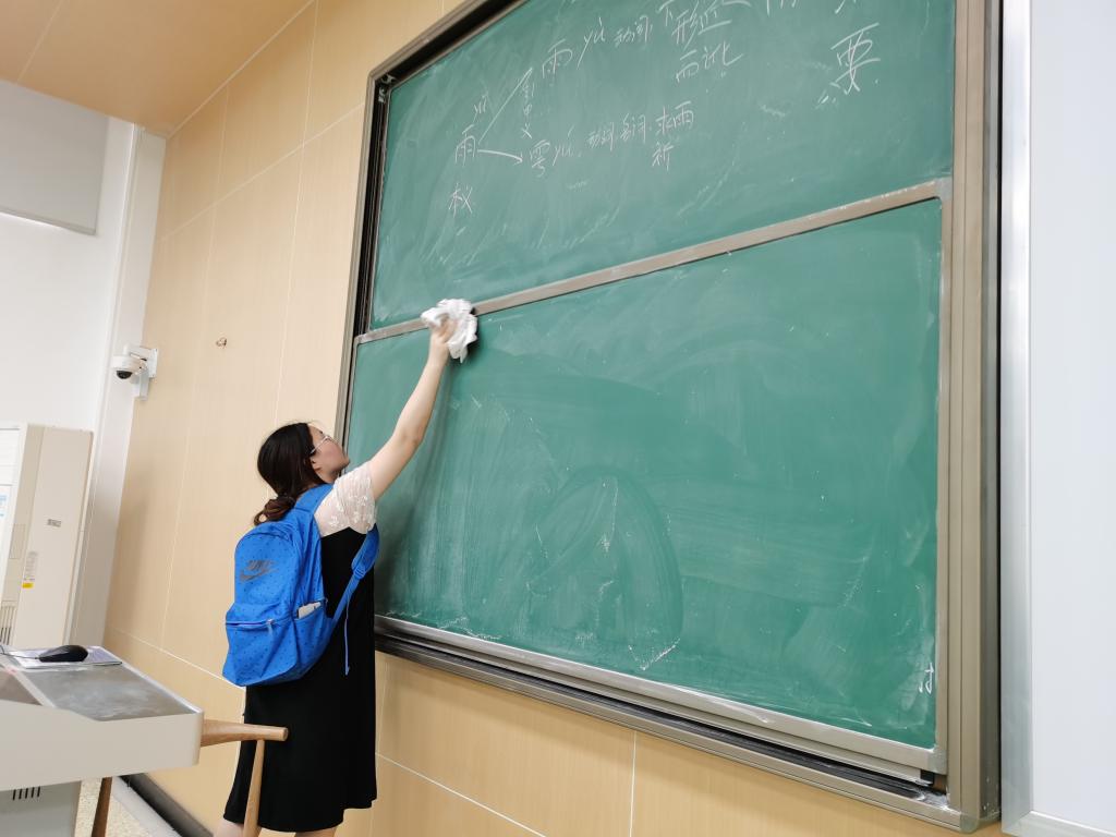 随后成员们将抹布用水浸湿,再将黑板上粉尘一一擦净,同时还将粉笔槽内的粉笔掏出,保证了黑板能正常滑动。活动完成后,蒋雯静进行清洁检查时发现部分教室讲桌粉笔摆放散乱,因此部分成员又将讲桌上粉尘擦洗干净,并整理了教具,清理了讲桌内的垃圾。成员们还随身携带了塑料口袋,将清理讲桌后产生的垃圾带走,进一步保证了教室整洁。