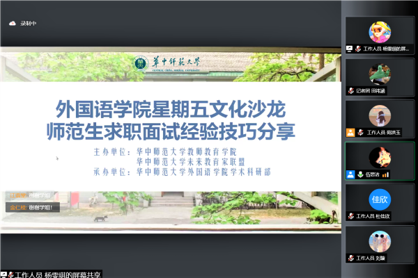 华大青年讯(通讯员 田祎涵)4月22日晚,外国语学院线上举办了师范生求职就业经验技巧分享会,本次活动由华中师范大学未来教育家联盟、教师教育学院主办,外国语学院学术科研部承办。分享会旨在响应国家关于高校毕业生实现更充分更高质量就业的号召,加强在校大学生对当前求职就业形势与前景的认识。外国语学院团委副书记牛静出席本次活动,2018级英语公费师范生伍思洁担任主讲人,外院主持队孙瑞青担任主持。