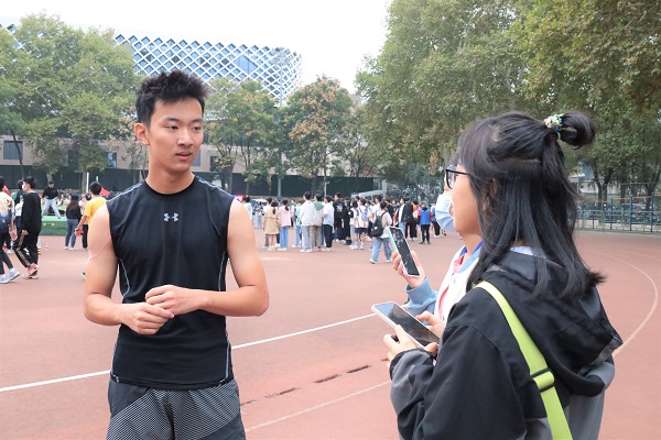 最先进行的是男子100米预决赛。起跑即冲刺是短跑比赛的一大特色,一声枪响后,选手们从起点处一冲而出,展现出惊人的爆发力。小组赛中,外国语学院运动员李炜坤起跑略微落后,但他在后期持续发力,反超了其他选手,率先冲过终点,获得小组赛第一。比赛紧张而热烈,观众的呐喊声、加油声震天,经过激烈的角逐,最终,李炜坤在学生组决赛中取得第五名的好成绩。