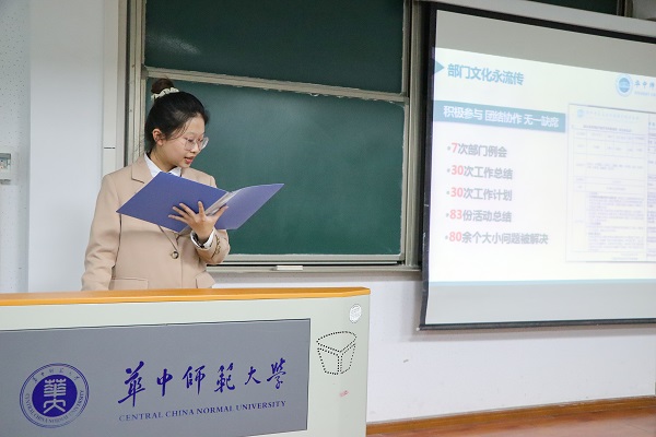 与会成员齐唱《中国共产主义青年团团歌》后,各部门负责人进行工作述职。组织部负责人王怡从思想引领、组织建设、实践育人三方面进行了工作总结,阐述了组织部在贯彻落实“三会两制一课”中做出的重要贡献。劳动教育实践部负责人徐子琴对历来活动与部门管理进行汇报,指出了劳育部在加强学生劳育意识的指导作用。在谈及活动中存在的问题时,她提出了创新活动形式、优化活动开展时间等改进措施。
