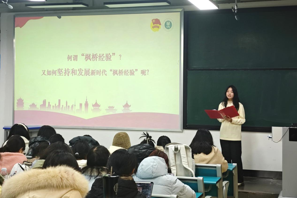 23级英语系的主题为“承枫桥经验,创治理新篇”。柳恩溪首先介绍了“枫桥经验”的历史,以上海市静安区天悦壹号小区 “社区合伙人” 项目为例阐述其当代演绎,并强调我校对“枫桥经验”的巧妙运用。华中师范大学因地制宜,举办校园调研大赛,推出电动车管理办法等,加深了师生对“枫桥经验”的理解,同时激发师生参与校园治理的热情。