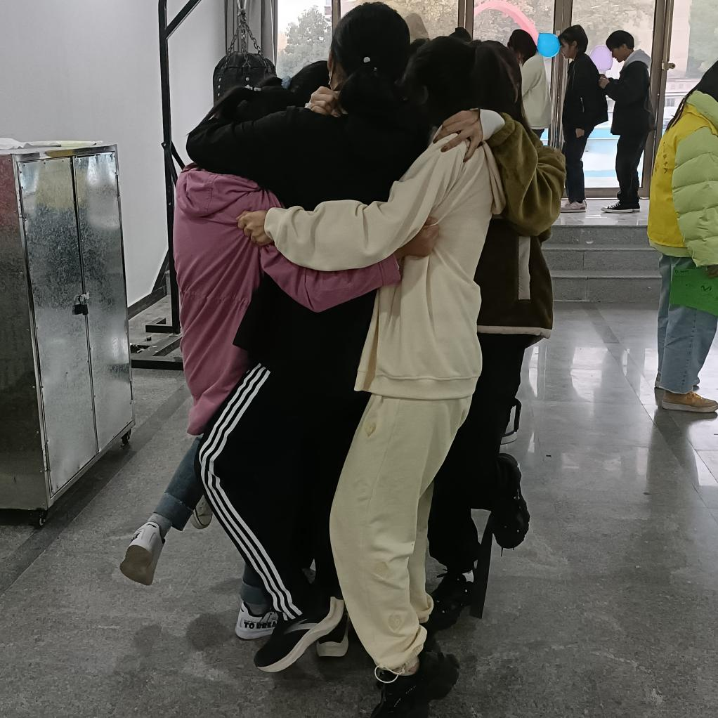小组展示后,各小组开始游戏闯关。游戏“金字人塔”要求营员们站在规定的矩形内,身体的任何部位都不能接触地面,保持10秒。要想要获得成功,营员们需要紧紧抱住,甚至背起自己的队友,大家相拥在一起,一支支胳臂构成保障队友安全的支架,成功通关了这一游戏。