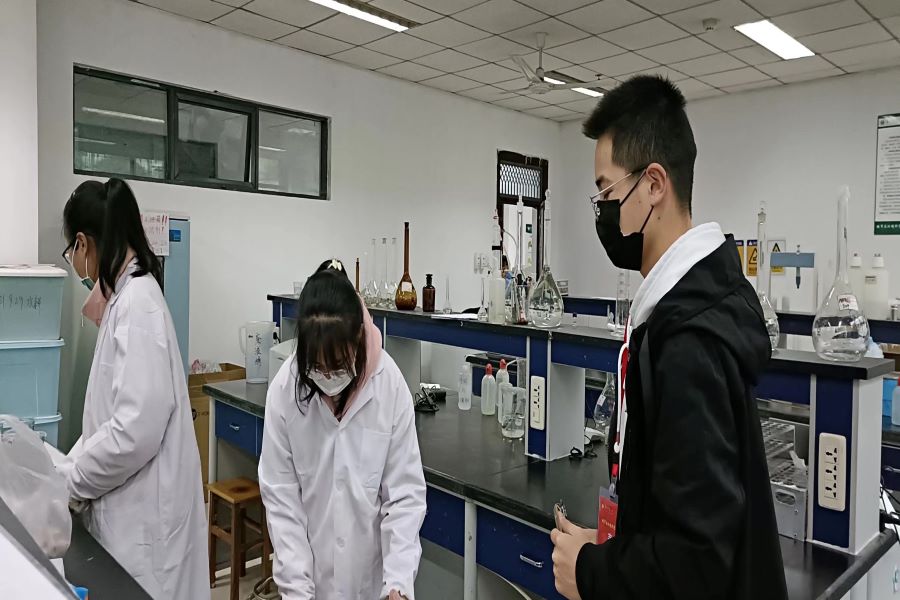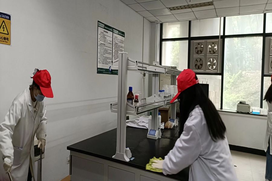 随后,志愿者们来到实验室进行清洁。首先由相关实验室负责老师为志愿者们讲解清扫的注意事项及相关安全规定,提醒打扫实验室的志愿者们注意电源及各种化学试剂,以确保清扫工作安全、有序进行。在了解了各项注意事项之后,志愿者们换上白色的实验服,带上红色的志愿帽,以小组为单位进入实验室,对实验室的桌面和地面进行整理与清扫,并在清理结束后将垃圾带离实验室。
