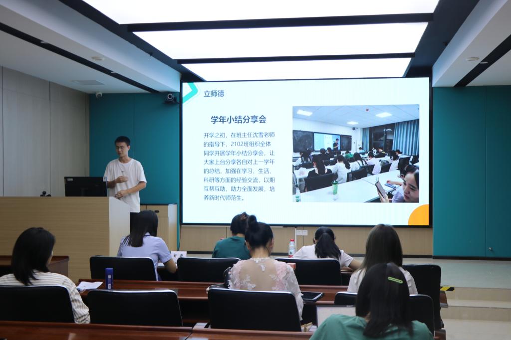 在现场答辩环节,各集体代表用PPT演示文稿辅助展示了班级同学在师范生技能、学生工作、综合评分成绩、志愿服务活动、师范生集体建设、创新创意比赛等各方面的情况与成就,总结陈述了一学年以来班集体的收获,并反思了不足之处。面对评委提问,各集体代表根据班级建设情况给予介绍和补充说明。