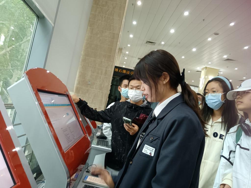 除此之外,全体同学于10月4日至7日按班分为四个小组依次进行实地参观。在参观过程中,图书馆志愿者介绍了图书馆中各楼层的资源分布情况以及各设施的使用方法,加深了参观者对图书馆的了解。每个班级成员都动手实践在自助借书系统和自助还书系统上完成借阅和归还手续,熟悉了基本操作。