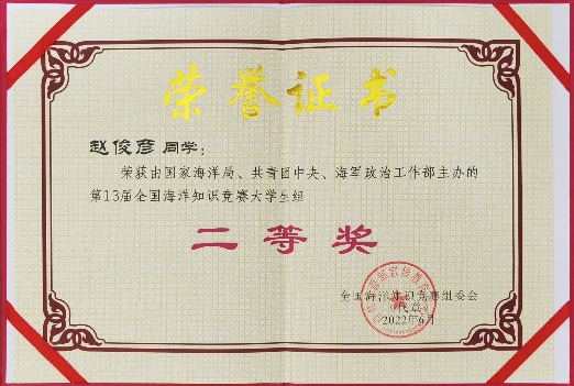 华大青年讯(通讯员 黄才润 马文琤)11月16日,第13届全国海洋知识竞赛大学生组决赛圆满落幕。城市与环境科学学院(以下简称城环学院)2020级本科生赵俊彦在本届比赛中荣获二等奖,学院副教授张海林获评优秀指导老师。