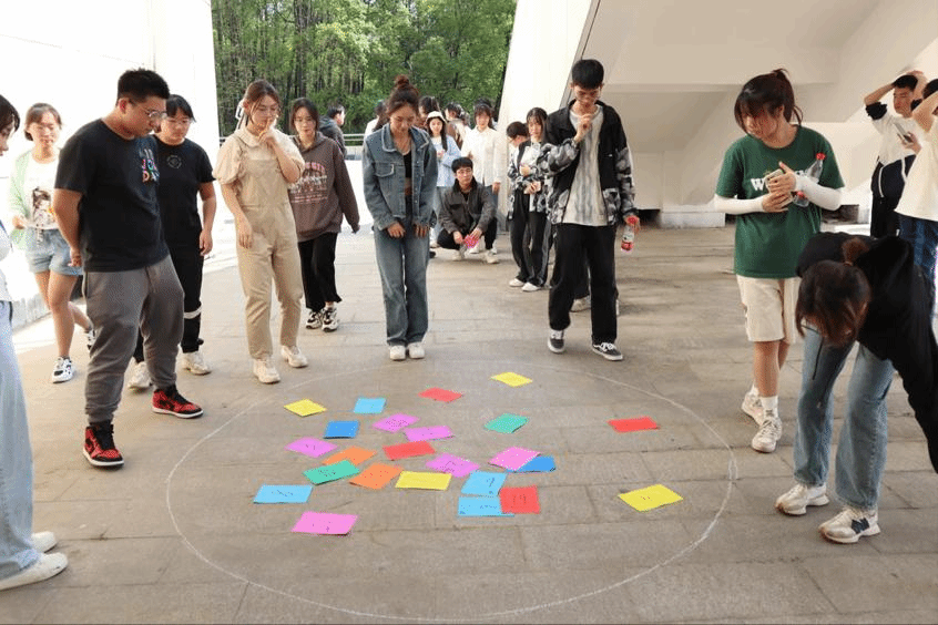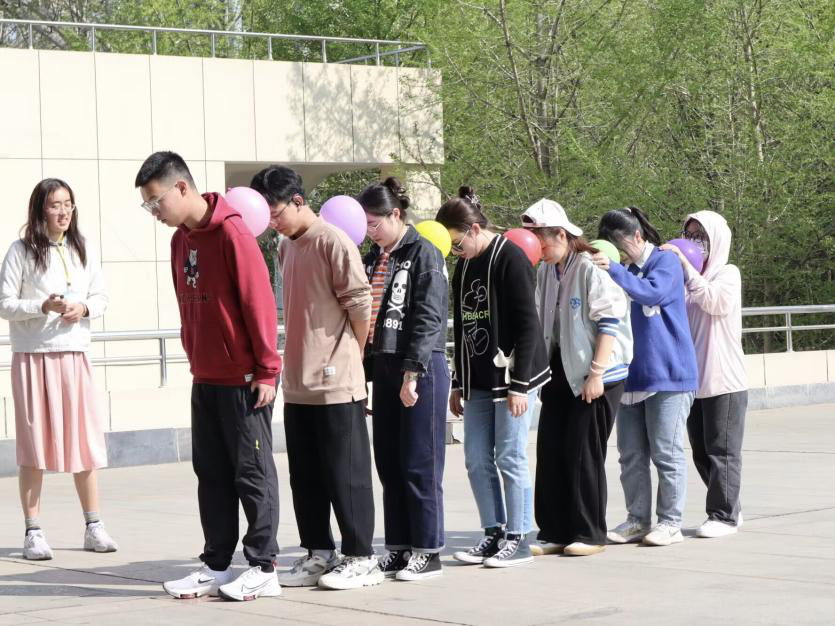 在小组分组进行队伍展示后,各小组开展通关游戏。游戏主要分为六关,包括“跨越雷区”、“无轨电车”、“金字人塔”、“葫芦兄弟”以及“盲人摸象”等,各小组需在最短时间内完成各项游戏。