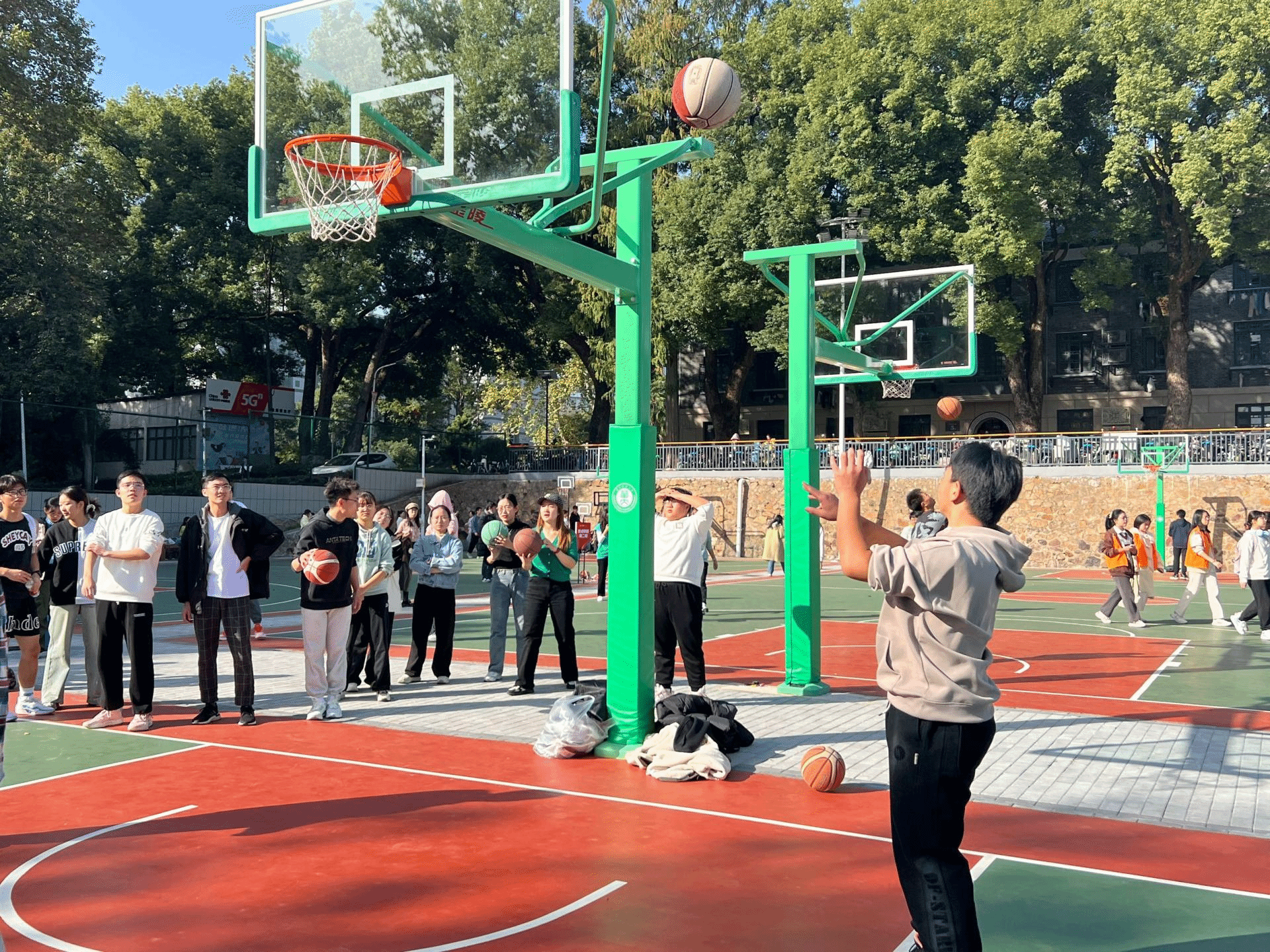 定点投篮比赛中,武煜创等10名运动员代表城环学院参赛。运动员们精神抖擞,摩拳擦掌,认真对待每一次投篮机会,投好每一球。他们目光紧盯篮筐,找准点位,运球调整手感,下蹲蓄力,屏息瞄准,发力出手,动作流畅,接连将球投进篮筐。