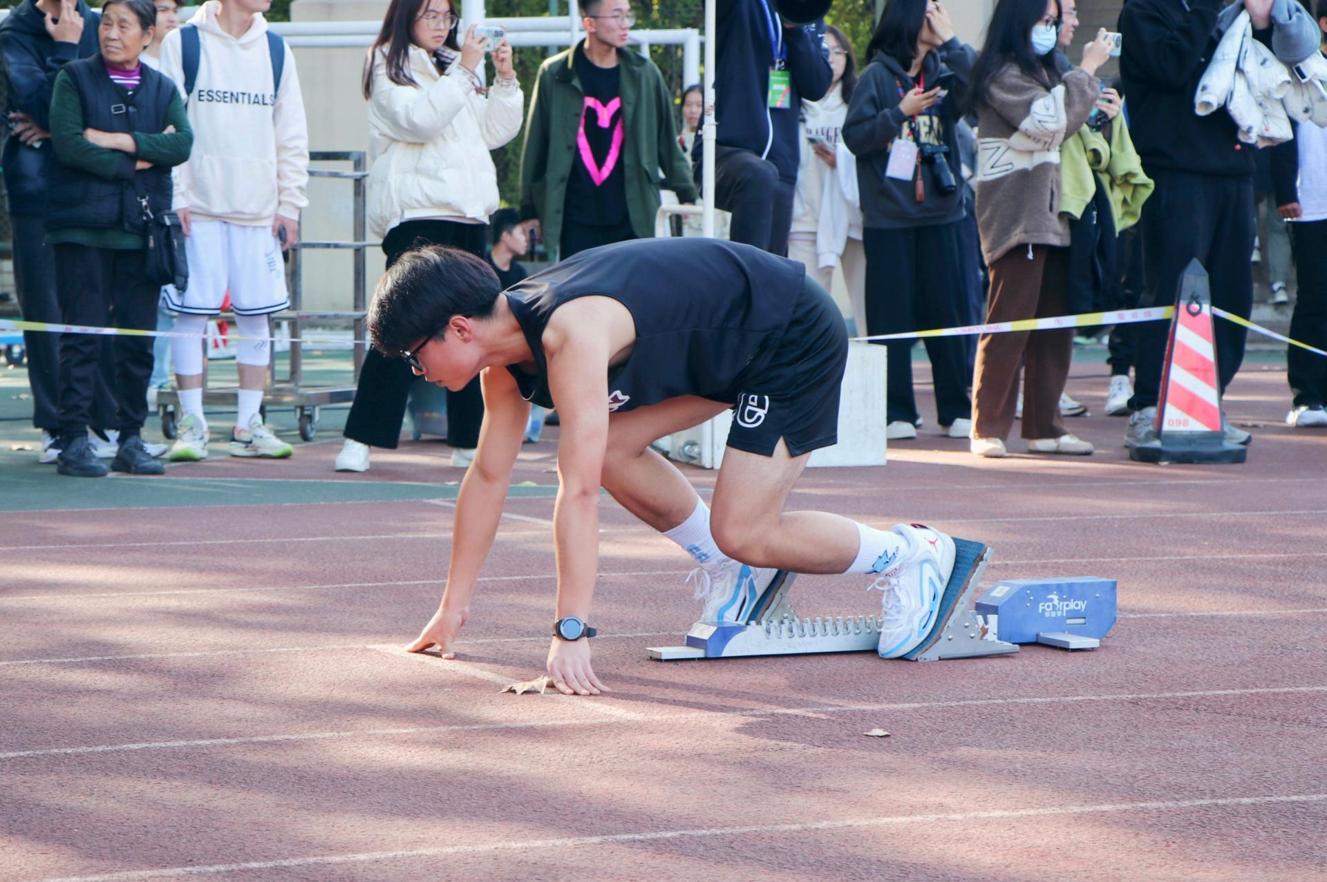 下午两点,男子400米比赛率先鸣枪开跑,马福财和陈宏杰代表城环学院参赛。运动员在起跑点拉伸肌肉、调整呼吸,进行充分的热身准备。裁判员一声枪响,运动员起身、弹射、跃出、加速,动作如行云流水般一气呵成,目光如炬直指终点,臂舞如风奋力向前。