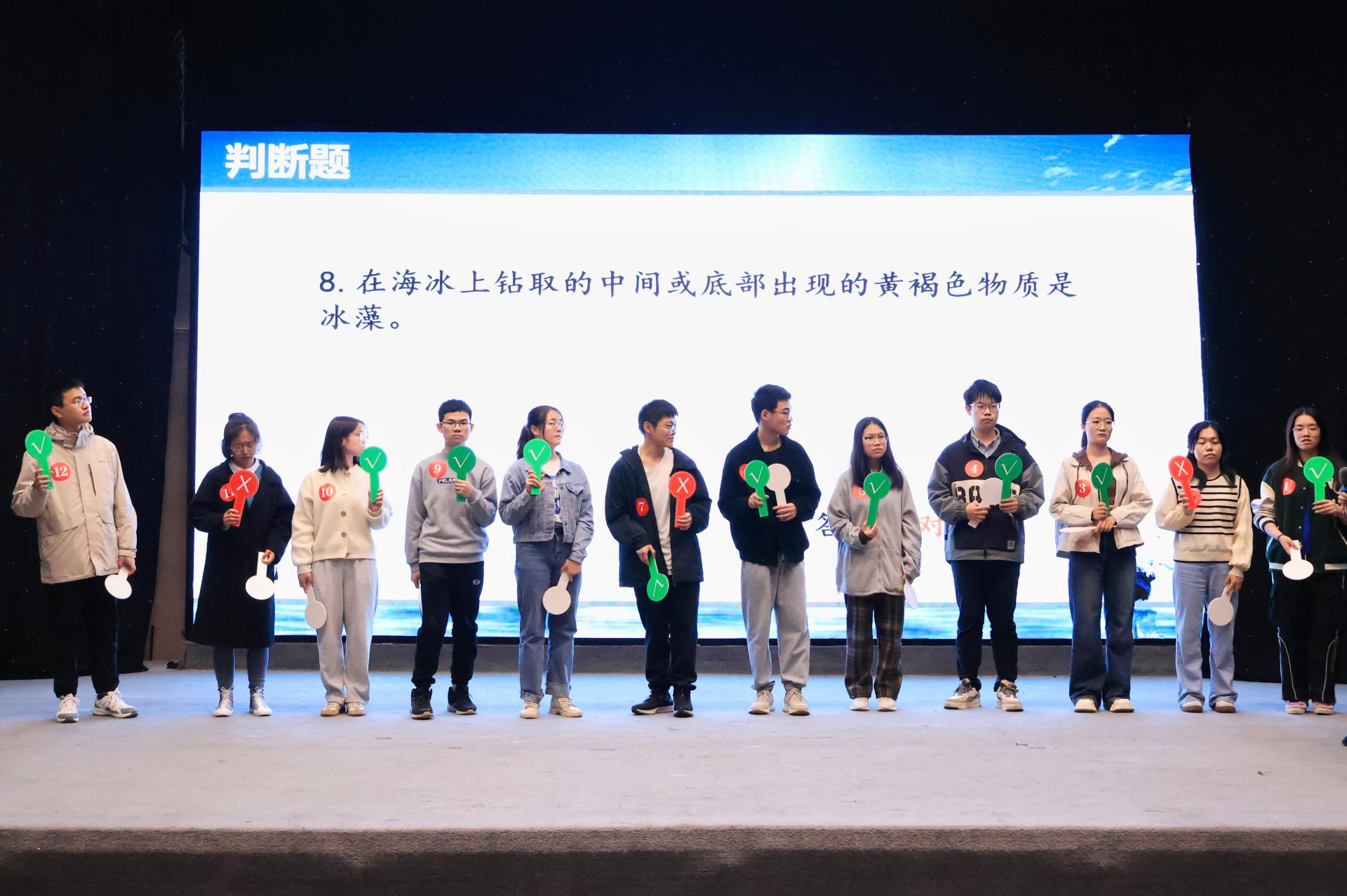 本次决赛共分为四个环节,包括“快问快答”、“1V1对抗赛”、“风险挑战”和“主题演说”,逐个环节确认晋级人选。比赛过程中,选手们深思熟虑,沉着应对,展现出了扎实的海洋知识和对于保护海洋环境的热情。最终,何旭、匡丰贝、夏佳嵘三位选手成功晋级“主题演说”环节。为增加现场观众的参与感,比赛还设置了有奖互动问答,同学们踊跃举手,气氛热闹非凡。