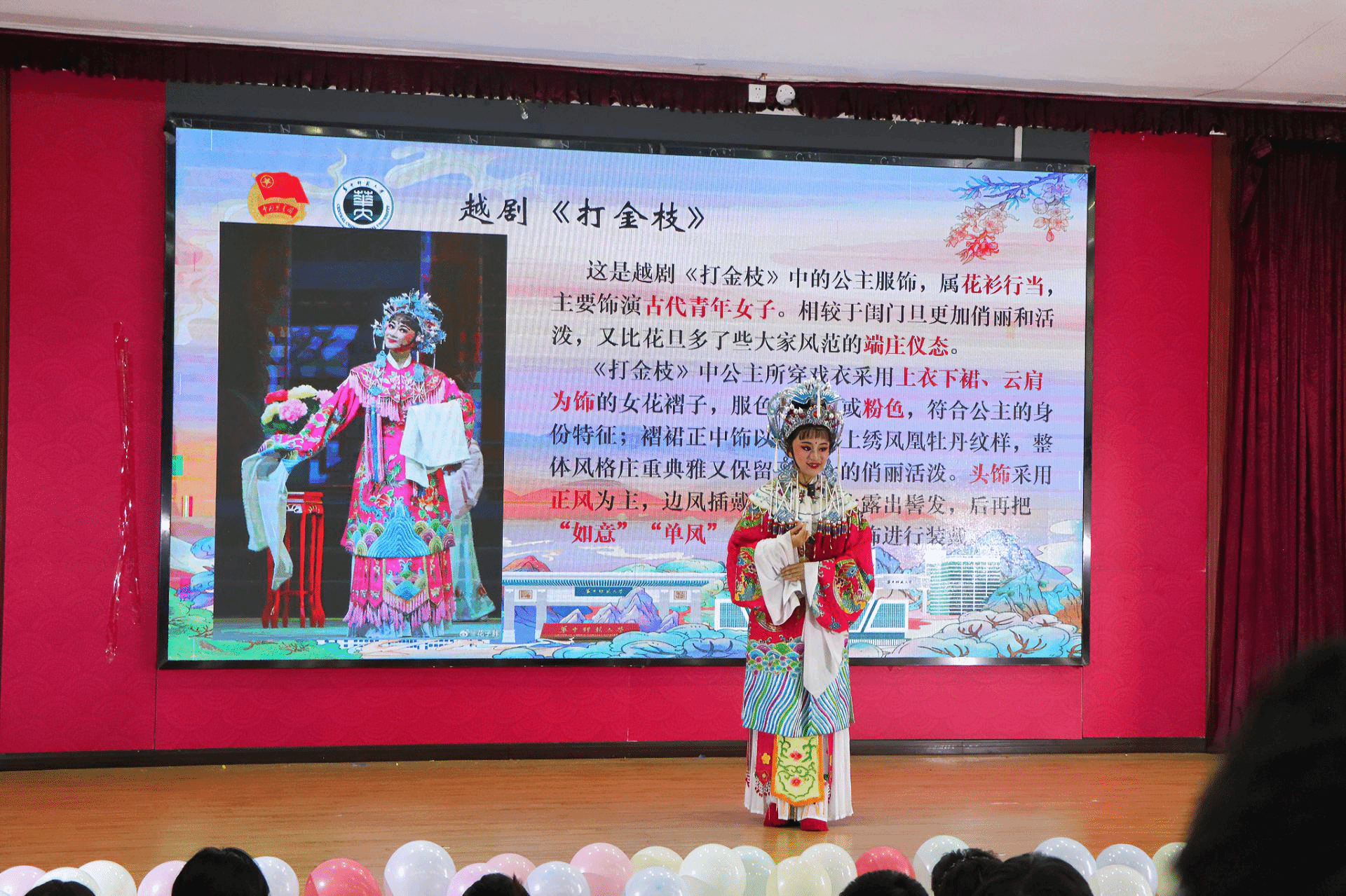 在“华夏上下五千年”环节中,参演人员身着不同朝代的传统服饰,带领观众感受服饰随时代变迁发生的演变。进行相关科普后,参演人员现场邀请观众上台试穿明制汉服,带来了生动有趣的观演体验。“寻迹国粹韵味浓”环节中,京剧、越剧表演和武打节目接连上场。演员们唱腔流利,在舞台上变换着姿态与步调,给观众们展示了一场壮观而华彩的国粹盛宴。
