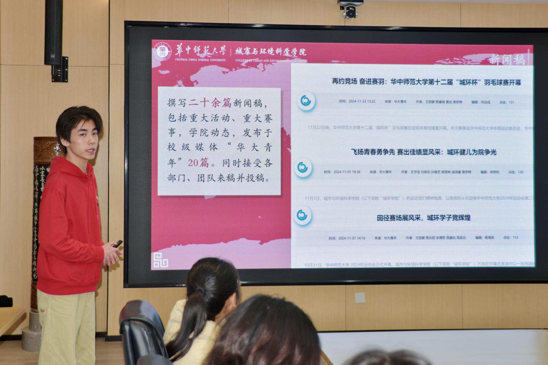 学院团委、学生会九个部门依次进行述职汇报。宣传中心主要负责人李继陈从重点宣传工作和媒体运营两方面出发,总结部门本学期的工作成果,并就提升宣传工作的质量提出建议;权益服务中心负责人许微从工作内容、部门建设、成员素质方面进行展示,并对后续工作做出明晰规划。随后,主席团成员总结本学期的工作内容并进行反思与展望。学生会主席庄耀杰详细总结各部门的创新机制,鼓励各部门积极思考、加强创新,促进团学工作的进步与发展。