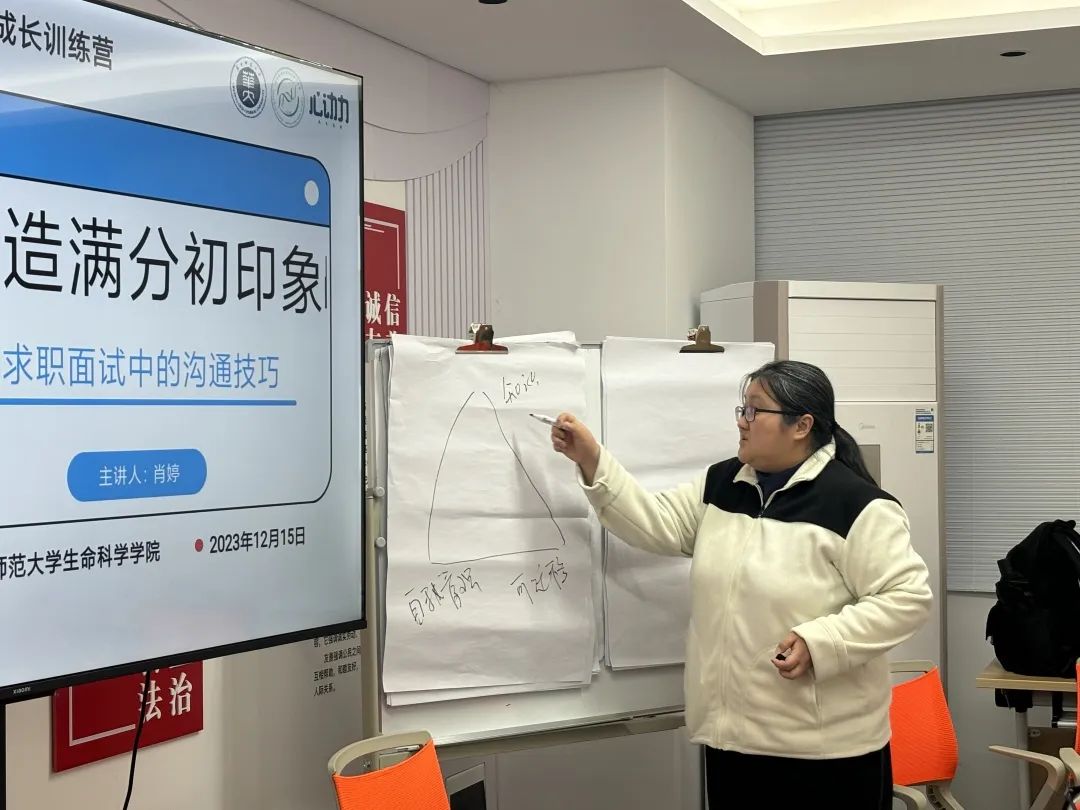 华大青年讯(通讯员 姚净静 杨丹)为做好有温度的研究生教育,挖掘研究生的内在潜能,提高研究生的自助能力,促进心理健康良好发展,2023年12月15日晚上,生命科学学院“心动力·和谐人际关系”研究生成长训练营以“打造我的满分印象:求职面试中的沟通技巧”为主题的第一期团体辅导在东十八学生一站式社区举行。生命科学学院辅导员兼心动力成长空间主持人余璇、生命科学学院2023级研究生兼职辅导员黄若楠出席了本次活动,同时特邀教育部“宏志助航计划”全国高校毕业生就业能力培训华中师范大学基地专家肖婷作为本次活动的授课教师。本次活动由黄若楠主持,共20余名研究生参与。