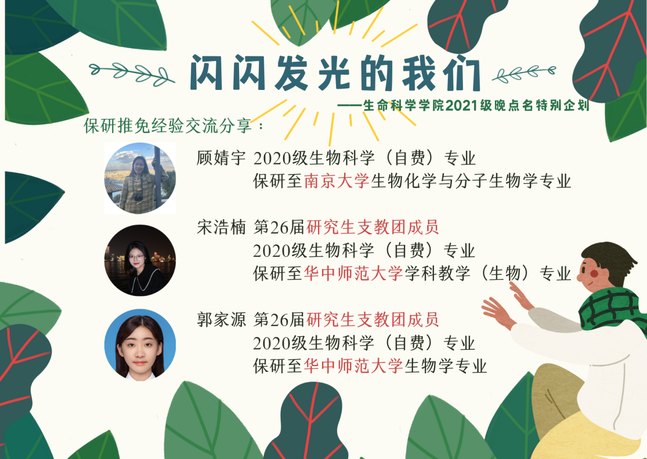 华大青年讯(通讯员 叶泓雅)为进一步做好有温度的教育,提高学院本科生生涯意识与核心竞争力,3月17日晚,生命科学学院举办了2024年保研经验分享会(第一期)暨2021级晚点名“闪闪发光的我们”主题教育活动。活动邀请到本科2020级推免生顾婧宇、郭家源担任分享人为同学们分享保研推免的经验与心得。