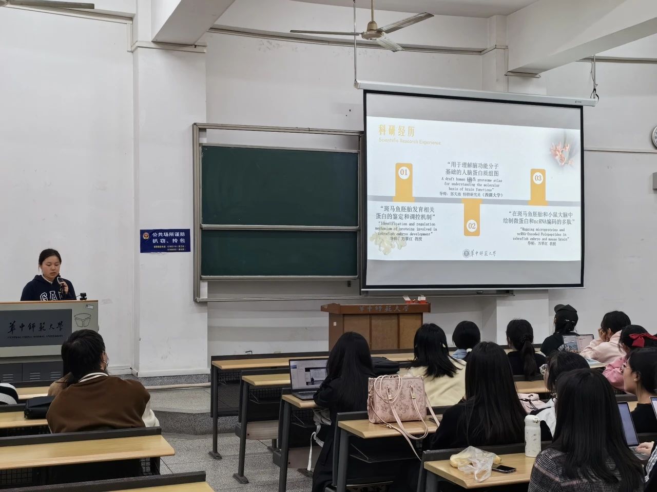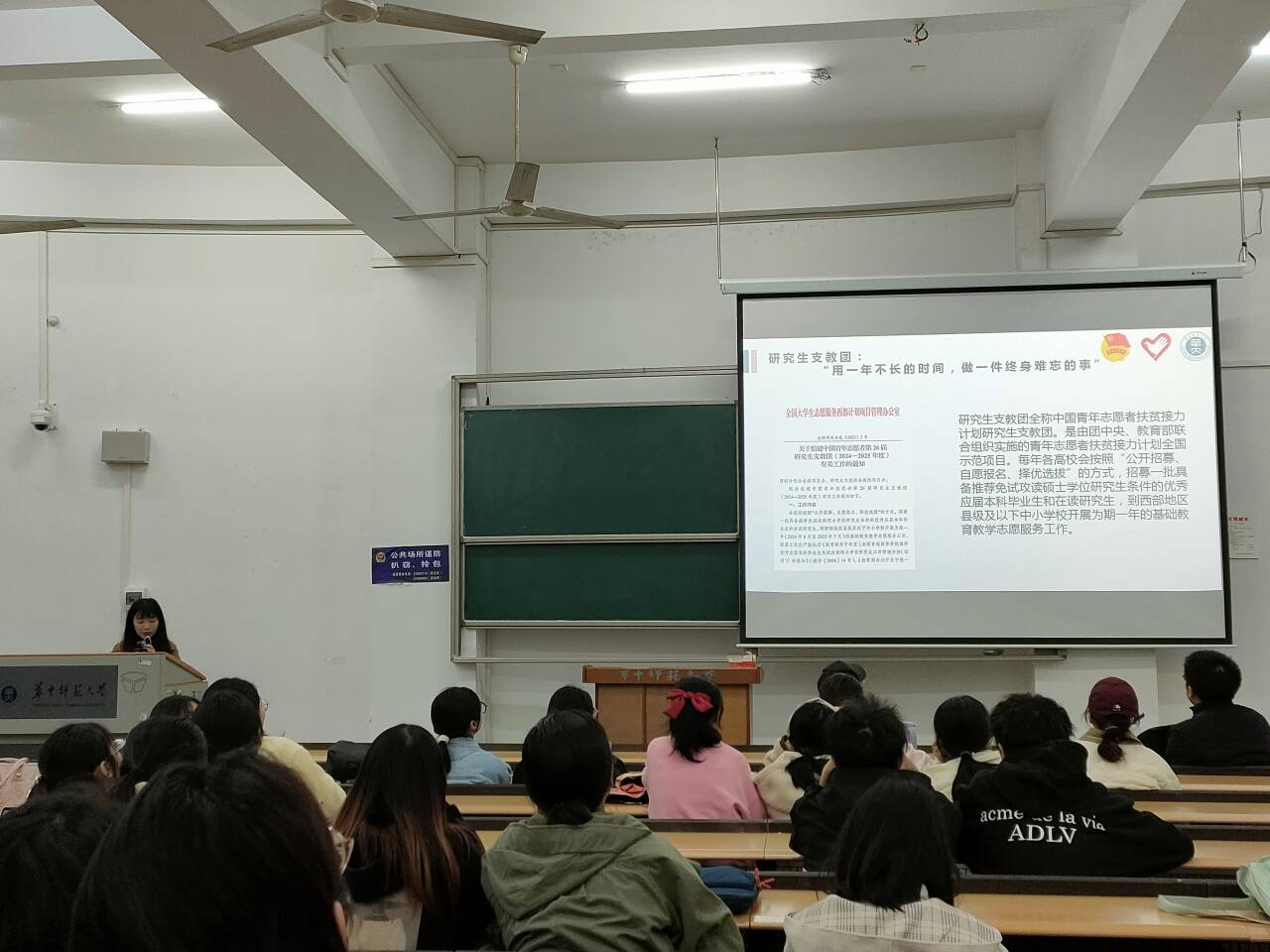 随后,郭家源分享了她入选本校第26届研究生支教团的经历,她在支教一年后将回到本院生物学专业继续攻读硕士。她详细说明了华中师范大学研究生支教团选拔的条件和流程,并且结合自己的经历,鼓励大家积极主动参与研究生支教团的报名。“不要因为没有勇气而不敢报名,放弃比失败更痛苦。”郭家源认为,即使目前的简历不太优秀也应该勇敢尝试,保研边缘人不应只把目光局限于自己“边缘人”的身份,也应该看到自己拥有更多的选择。