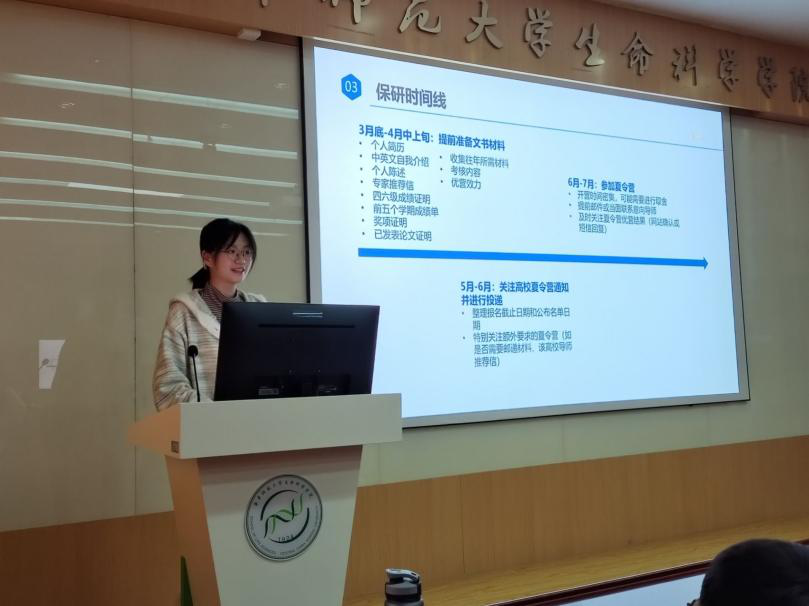 邱同心则以自身的科研经历为引,详细讲述了“保研时间线”上的关键节点,并分享了关于夏令营材料准备的个人建议。她特别强调了提前准备文书材料的重要性,提醒同学们要密切关注各大高校的夏令营通知,并及时投递申请材料。同时,需留意预推免的相关信息,争取获得推免名额。最后她强调,务必在研招网上进行报名确认,确保所有流程无误。邱同心鼓励大家:保研虽是一件难事,但要敢于挑战自我,不要因为害怕就轻言放弃,那将是非常可惜的。只有勇往直前,才能收获属于自己的成功与喜悦。