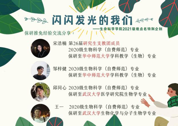 华大青年讯(通讯员 余奕昀 王妍婷)学海无垠,征程辽阔,为帮助生命科学学院本科生明确未来方向,做好生涯规划,3月22日下午,生命科学学院举办了保研经验分享会(第二期)暨2021级特别企划“闪闪发光的我们”主题教育活动。本次保研经验分享会由生命科学学院本科2020级的推免生宋浩楠、邹梓健、邱同心和王一担任分享人。他们以自身经历为基础,为与会学生分享宝贵的保研推免经验和建议。