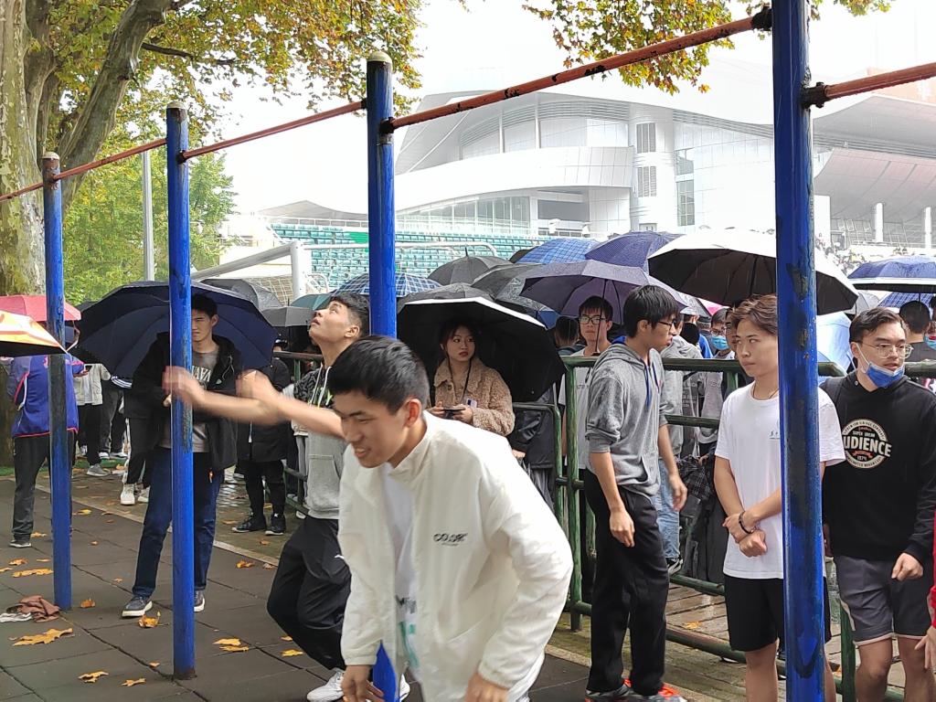 引体向上项目主要考验人体核心力量和耐力。此外,受阴雨天气影响,单杠与地面均较为湿滑。以上种种因素都使此次比赛具有较高的挑战性。比赛开始后,排在各队列第一位的同学纵身跳跃,用双臂抓住单杠,迅速做好预定动作并进入比赛状态。其中,马院2021级本科生罗玉铉同学作为首批上场的选手之一,取得了连续12个引体向上的好成绩,为后面的同学作出了表率。