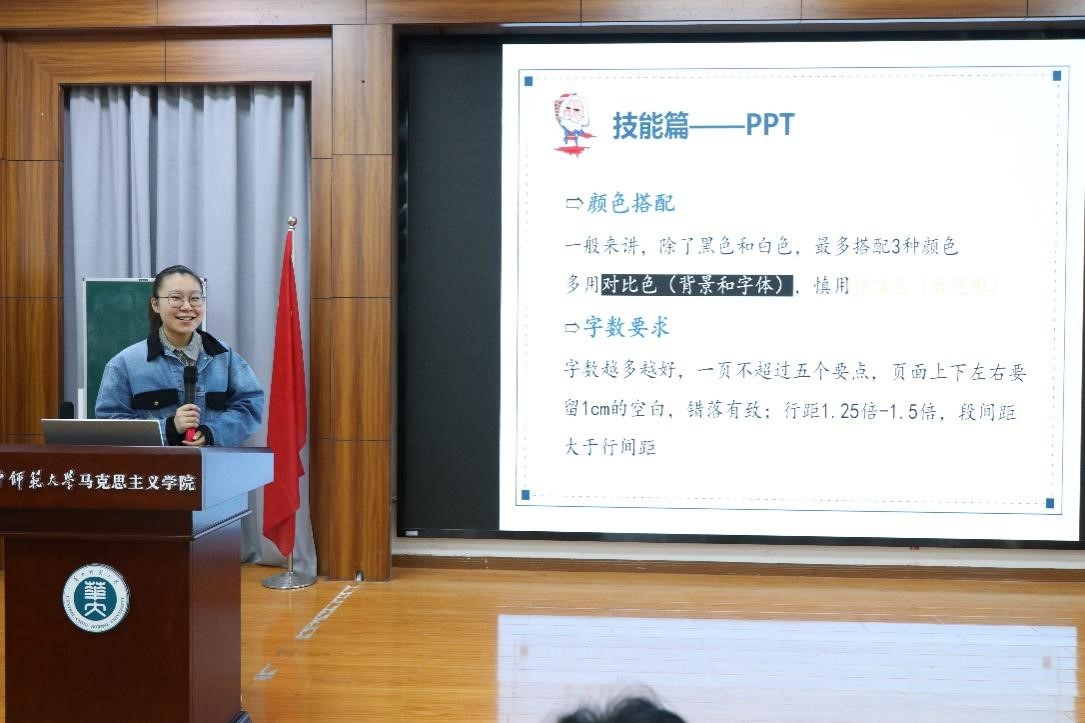 文化沙龙开始,主讲人黄欣然就教学PPT制作和微课制作进行了经验分享。在PPT制作方面,她从颜色搭配、字体搭配、PPT尺寸、图文并茂等角度分享了演示文稿的制作经验,并通过反面案例来进行直观阐释;在微课制作方面,她先介绍了微课制作的具体步骤及基本类型,之后以微课评价指标为依据讲解了制作微课的技巧与注意事项。最后,她建议同学们先通过观看优秀教师的微课视频进行学习模仿,再在实践的基础上逐步形成自己的教学特色与教学风格。