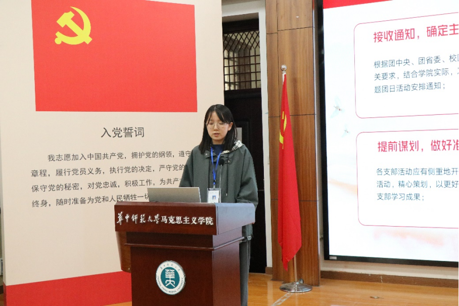为了提升各团支部团日活动质量,2101班团支书瞿士凡、2102班团支书莫枫佳、2103班团支书许覃科依次上台进行团日活动经验分享。瞿士凡表明策划案的撰写应注意活动的名称、背景、时间及前中后期整个过程。莫枫佳强调开展团日活动的形式要多样化,可采取线上线下、室内户外等多种形式以鼓励同学积极参与,也可以借助实践课程、知识竞赛等方式。许覃科则表示可邀请班主任、辅导员等嘉宾出席活动,并注重在活动前做好规划、采取分组竞赛、奖惩结合的方式提高活动的趣味性。