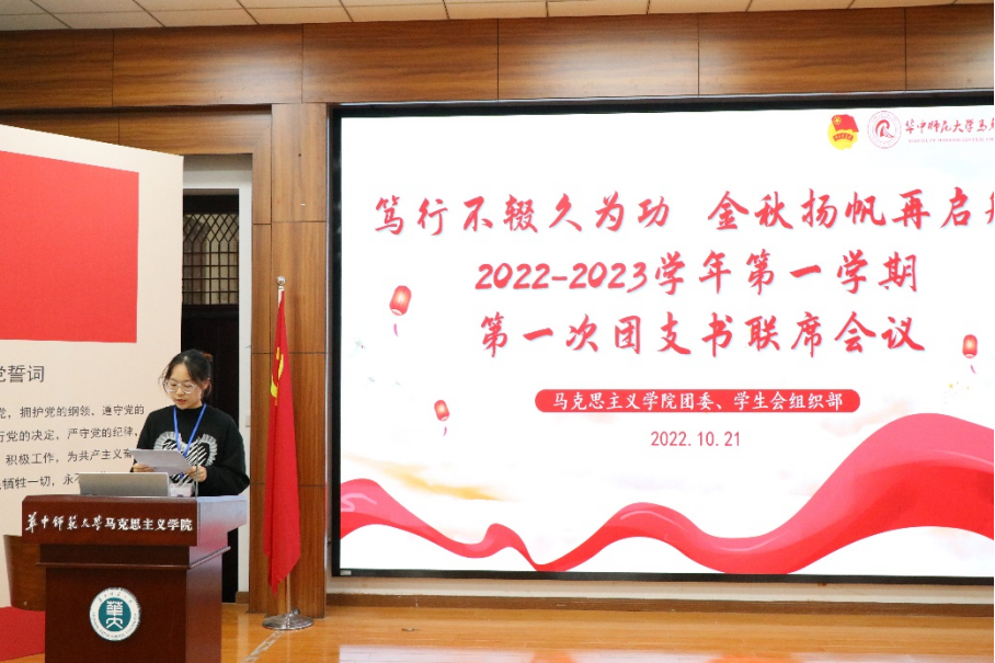 华大青年讯(通讯员 邓潇潇)10月21日中午,马克思主义学院“笃行不辍久为功,金秋扬帆再起航”2022-2023学年第一学期第一次团支书联席会议在一号楼1101教室举行。本次会议由马克思主义学院团委、学生会组织部主办,组织部全体成员和各团支部负责人出席本次会议,组织部负责人石梦洋担任本次会议主持人。