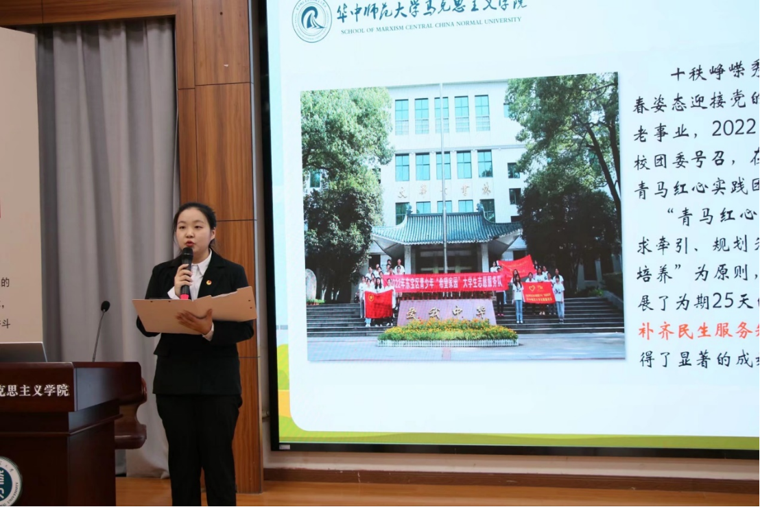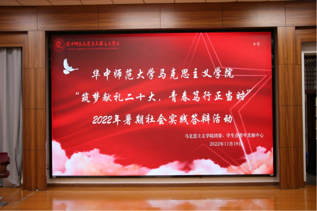 华大青年讯(通讯员 尹赵柯)11月18日下午,华中师范大学马克思主义学院2022年暑期社会实践答辩活动于一号楼1101教室举办。马克思主义学院党委副书记邵莉莉、副院长邵彦涛、2019级本科生辅导员王海龙、2020级本科生辅导员兼团委书记赵芸逸、2021级本科生辅导员程金松和2022级本科生辅导员田聪娇担任本次活动评委。活动由团委、学生会青年发展中心举办,青年发展中心成员薛聪颖担任主持人。