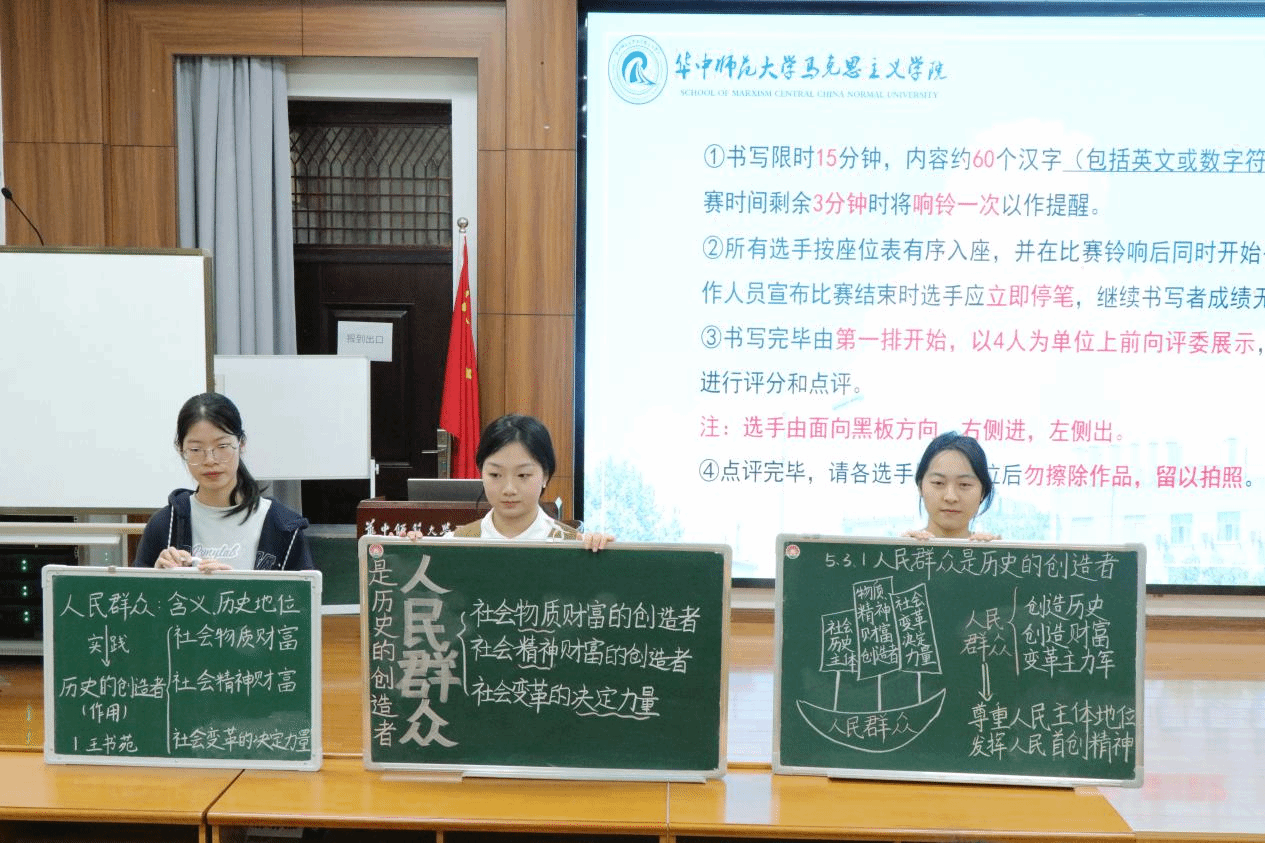 华大青年讯(通讯员 李黄帆)4月8日下午,马克思主义学院于一号楼1101教室举行第十六届粉笔字板书设计大赛。马克思主义学院2022级本科生辅导员田聪娇,华中师范大学书写指导团成员张艺馨、常钰彤、龚若楹作为评委出席比赛。本次比赛由马克思主义学院团委、学生会师范生训测部承办,廖云欣任主持人。