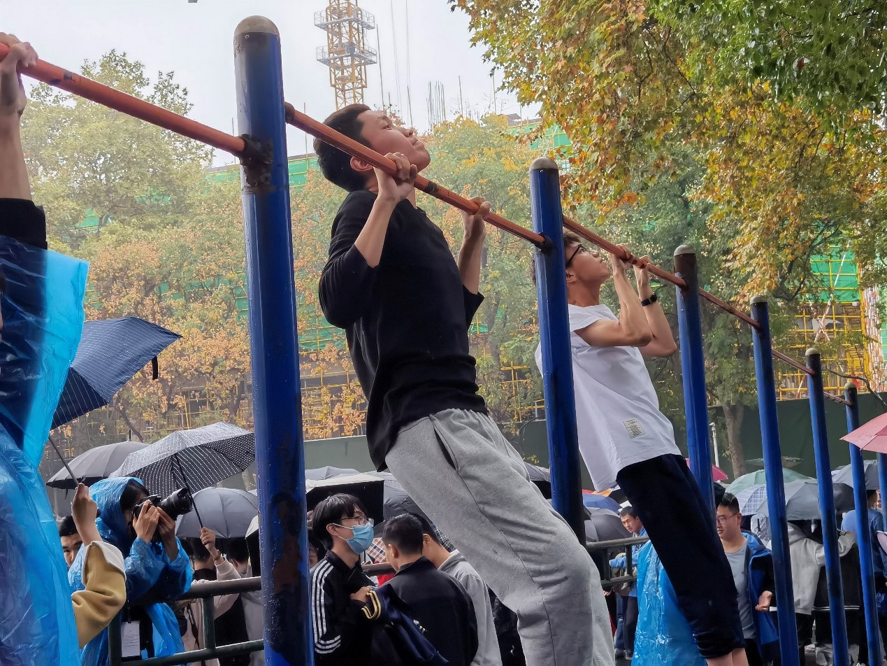 引体向上是测试上肢肌肉力量发展水平、衡量男生体质的重要参考标准和项目之一。比赛时恰逢天降小雨,在这样的不利条件下,教院健儿毫不退缩,用宽厚的手掌紧握着高于头顶的横杠,有力的双臂拉起身体的每一次上升。选手们咬牙坚持,雨水和汗水见证了他们的努力;观众们热情喝彩,欢呼和掌声传达了他们的鼓励。