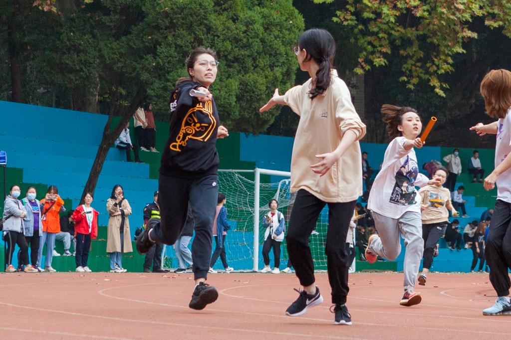 随着发令枪响,比赛正式开始。运动员们紧绷神经,铆足劲头,朝着终点线飞奔而去。男子组比赛中,教育学院四位运动员根据赛前练习的情况,摆平心态、奋力迈步,利用规范摆臂、增大步幅等技巧加快速度,在志愿者和观众的助威声中冲过终点。女子组比赛中,教育学院四名运动员配合默契,把握好交接棒的距离,争取将过渡时间缩短,缩短整体用时。在教院观赛人员的呐喊助威声中,四名运动员保持着良好状态,在奔跑中突破自我,以自身最好成绩完成比赛。