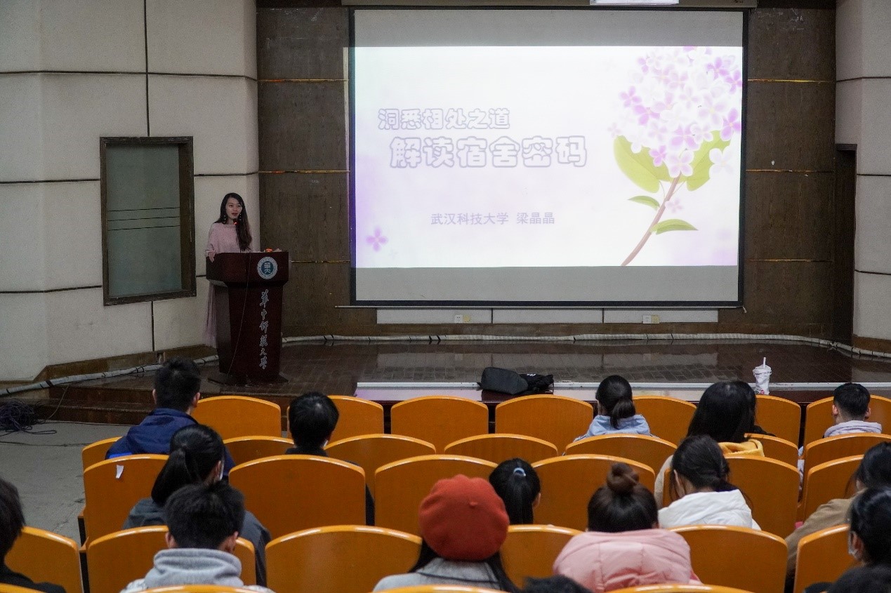 接着,梁晶晶指出了影响大学宿舍关系的重要因素,同时就相处过程中的环境变化、预期差异等方面进行说明。她表示,大学宿舍关系难处理的原因主要由于环境的转变及个人对友谊预期的降低。“高中时一群人的高中,而大学是一个人的大学,这换生活环境的突然转变对于关系形成有着较大影响。”梁晶晶提到。此外,她还对相处信息失真、个体性格区别、交往技能匮乏等现象做出分析,以深化现场同学对于宿舍关系发展过程的认识。