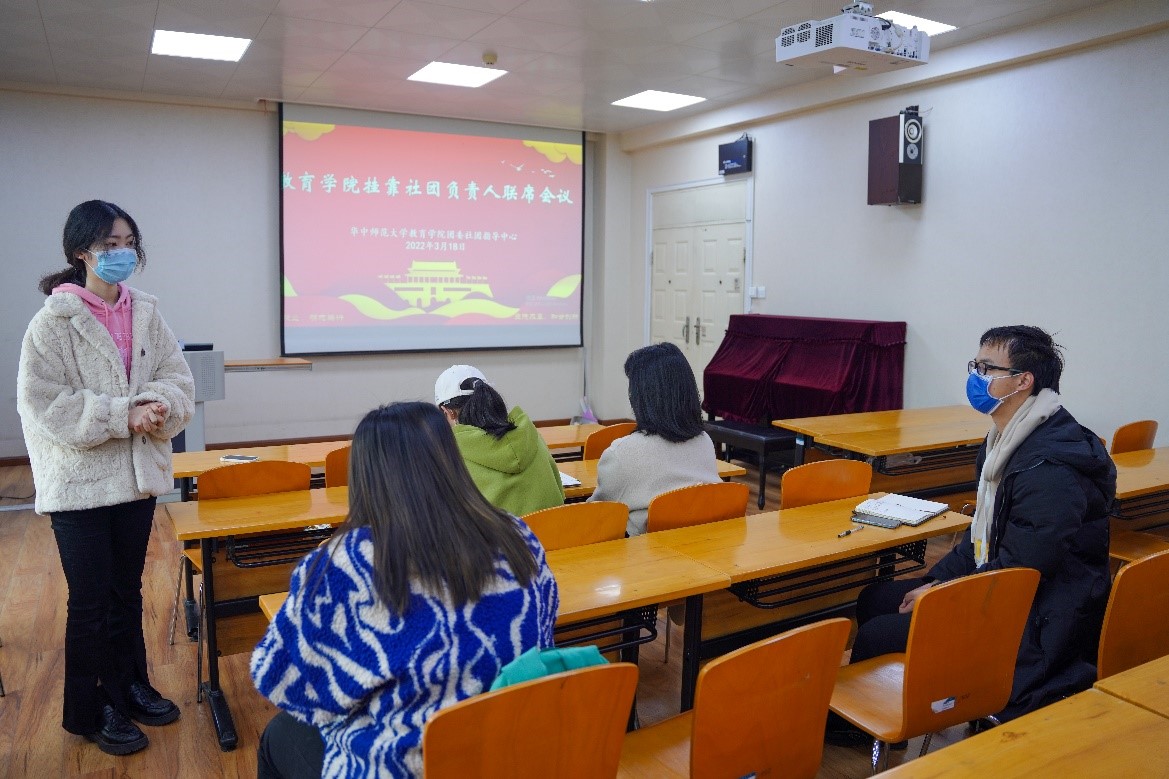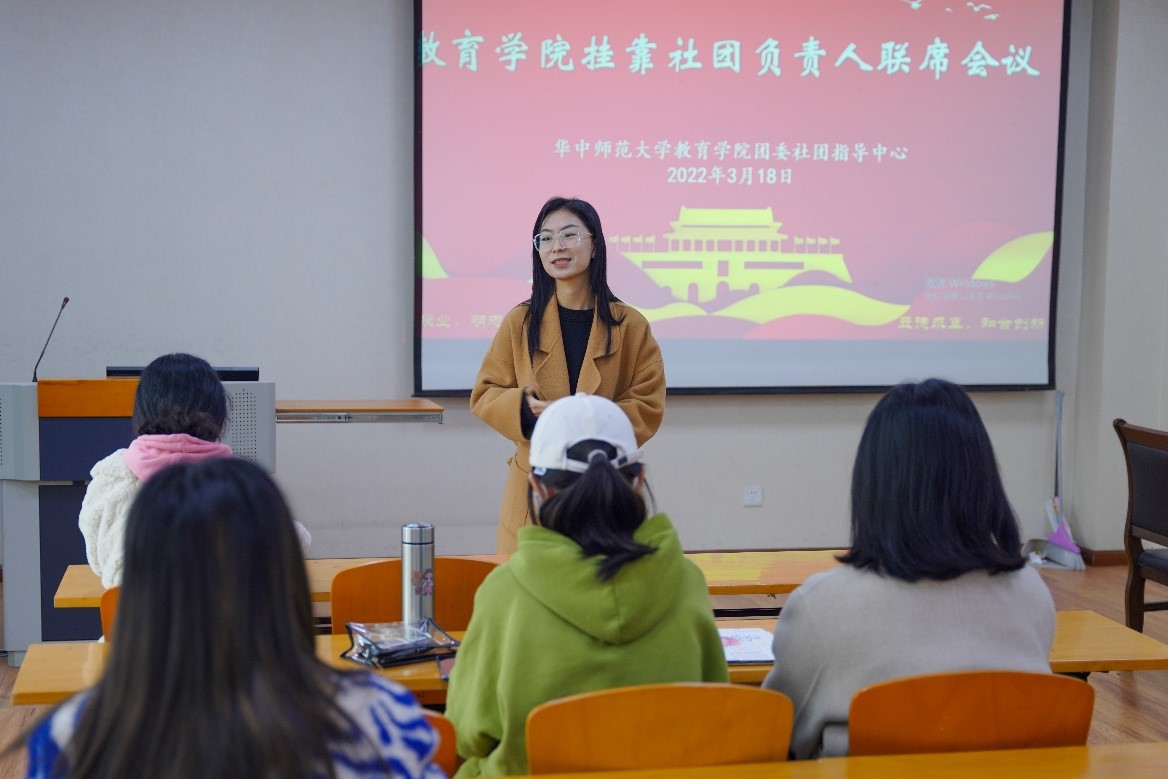 华大青年讯(通讯员 陈祯盈 赵恒健)3月18日,教育学院挂靠社团负责人联席会议于田家炳教育大楼502教室举行。教育学院团委书记刘雅欣出席本次会议,团委社团指导中心成员及各挂靠社团负责人参与会议。会议由团委副书记彭雨茜主持。