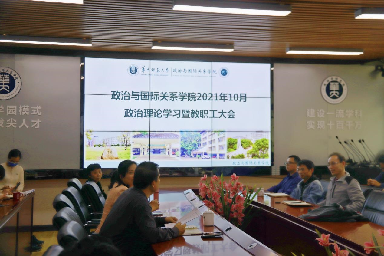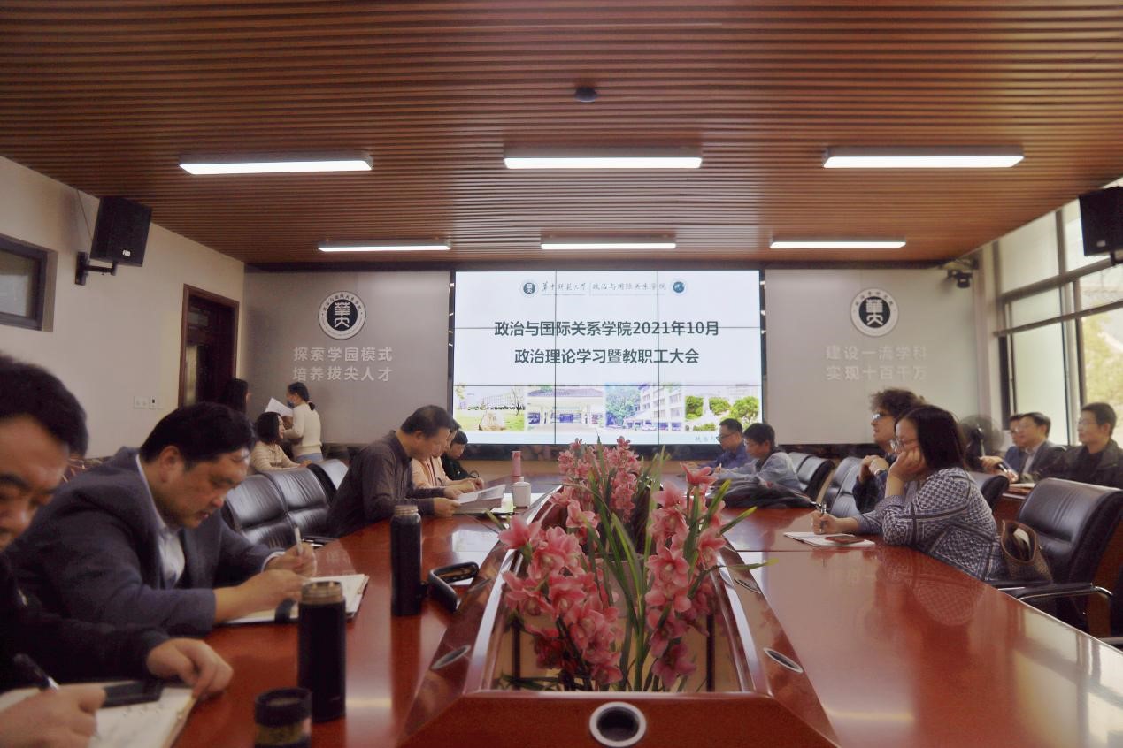 华大青年讯(通讯员 车孟书)10月29日下午,政治与国际关系学院(以下简称:政国院)于313会议室召开10月政治理论学习暨教职工大会。本次会议由院党委书记段维主持,全体教职工参加。