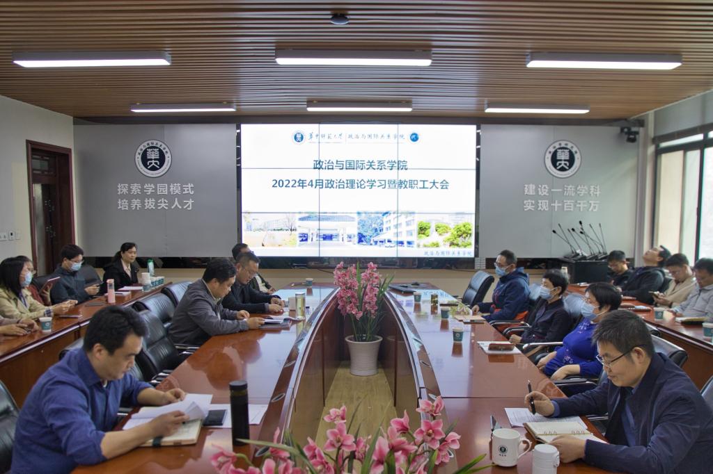 华大青年讯(通讯员 柯鹏灿)4月29日下午,政治与国际关系学院(以下简称:政国院)于313会议室召开2022年4月政治理论学习暨教职工大会。本次会议由院党委副书记潘广炜主持,全体教职工参加。