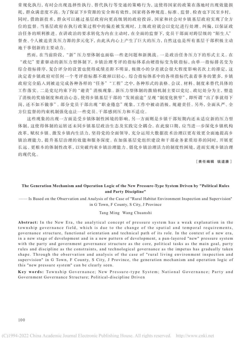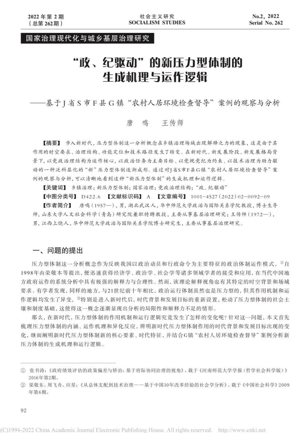 华大青年讯(通讯员 续静怡)近日,政治与国际关系学院教授、博士生导师唐鸣,政治与国际关系学院博士研究生王传师的论文《 “政、纪驱动”的新压力型体制的生成机理与运作逻辑——基于J省S市F县G镇“农村人居环境检查督导”案例的观察与分析》引发学院学生积极讨论。该论文首先梳理压力型体制的内涵、运作机理和异化反应,辨明新时代压力型体制作用的时代背景和发展目标出现的变化,继而阐明新时代压力型体制新的核心要素、时代特征,并结合G镇“农村人居环境检查督导”案例分析新压力体制的生成机理和运行逻辑。