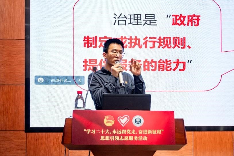 丁羽以“为什么要了解‘中国式现代化’这一主题”为引,通过对中国式现代化与城乡治理现代化的概念剖析向同学们进行了深入讲解。他提到,中国式现代化是我们党团结带领全国各族人民开创和形成的。在新中国成立特别是改革开放以来长期探索和实践基础上,经过党的十八大以来在理论和实践上的创新突破,党成功推进和拓展了中国式现代化。