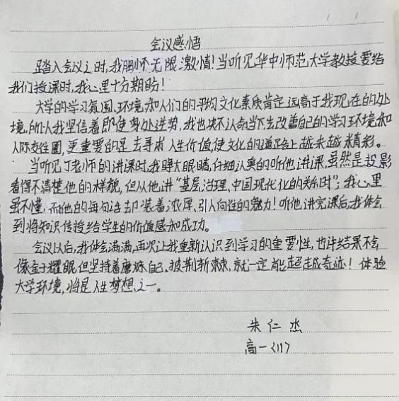针对几位同学关于社区治理、县域城乡融合发展的提问,丁羽提到,在推进治理效能提升的过程中,要构建新机制、激发新活力、凝聚新合力,使人民获得感、幸福感、安全感更加充实、更有保障、更可持续。本次宣讲在他山中学、华师牟定附属中学反响热烈。活动结束后,两所中学的学生纷纷动笔写下感悟,表达了对全面建设社会主义现代化强国的坚定信念。