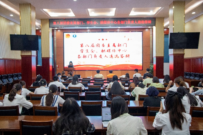 会上,向欣慧对本次遴选的选拔原则和选拔方式进行了详细介绍。本次遴选答辩分为两分钟自我陈述和一分钟评委提问两个环节,按团委直属部门、学生会、融媒体中心的顺序,组织部、青年志愿者协会、社团管理部、学术与创新中心、维权服务与调研中心、文艺部、体育部、办公室、摄影队、技术部、记者团、新媒体部各位候选人依次进行答辩。