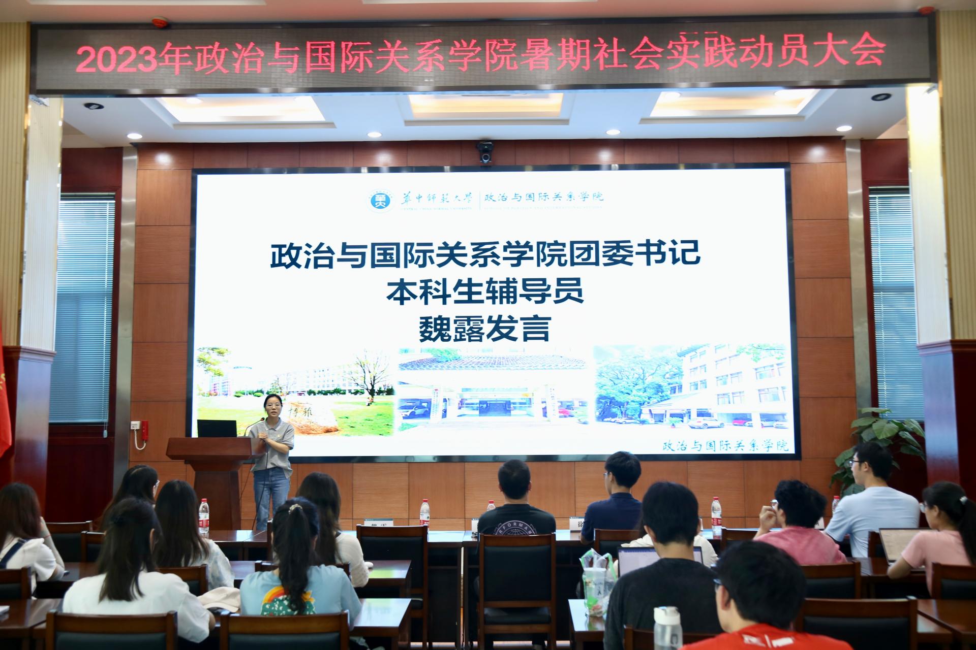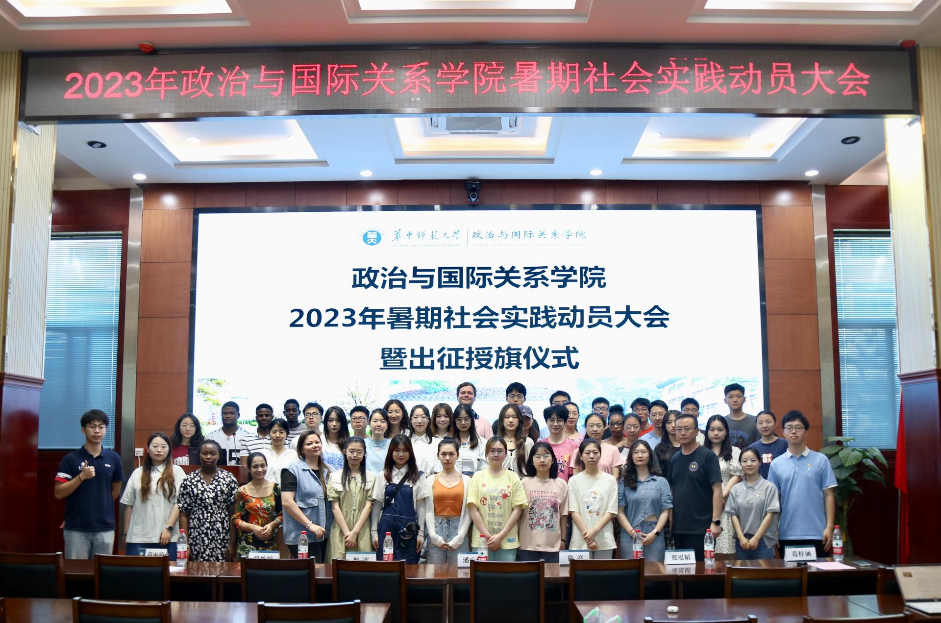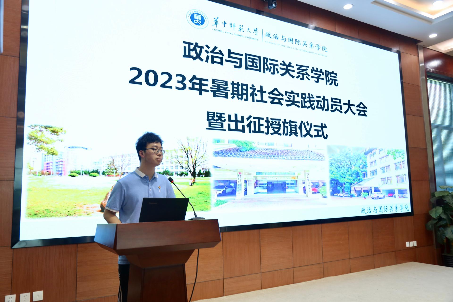 华大青年讯(通讯员 邱锐)6月26日下午,政治与国际关系学院2023年暑期社会实践动员大会暨出征授旗仪式在模拟联合国实验室举行。政国院党委副书记潘广炜,国际文化交流学院留学生辅导员徐亮,政国院团委书记魏露、研究生辅导员骆婉婷出席活动,暑期社会实践指导老师代表,“知行”暑期社会实践队江西分队、宜昌分队、港澳分队全体成员,国际文化交流学院暑期社会实践队全体成员参加。会议由院团委副书记郑泓韬主持。