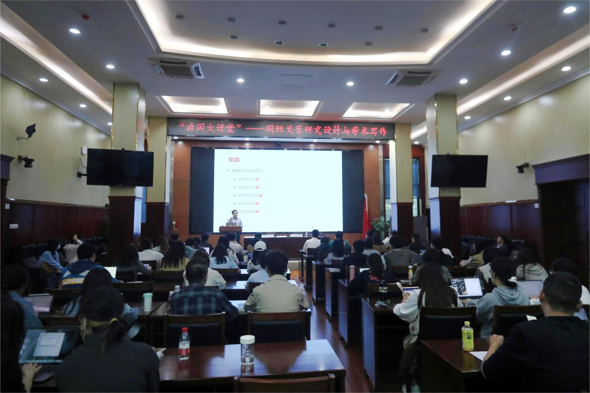 华大青年讯(通讯员 何钰琪)10月27日至29日,由华中师范大学政治学部、华中师范大学政治与国际关系学院主办的“政国大讲堂”系列讲座在模拟联合国实验室举行。清华大学国际关系学系教授、博士生导师刘丰作了题为“国际关系研究设计与学术写作”的学术讲座。政治与国际关系学院国际政治专业2021、2022级硕士生、博士生以及部分本科生集中聆听。本次讲座由政治与国际关系学院院长胡宗山主持。